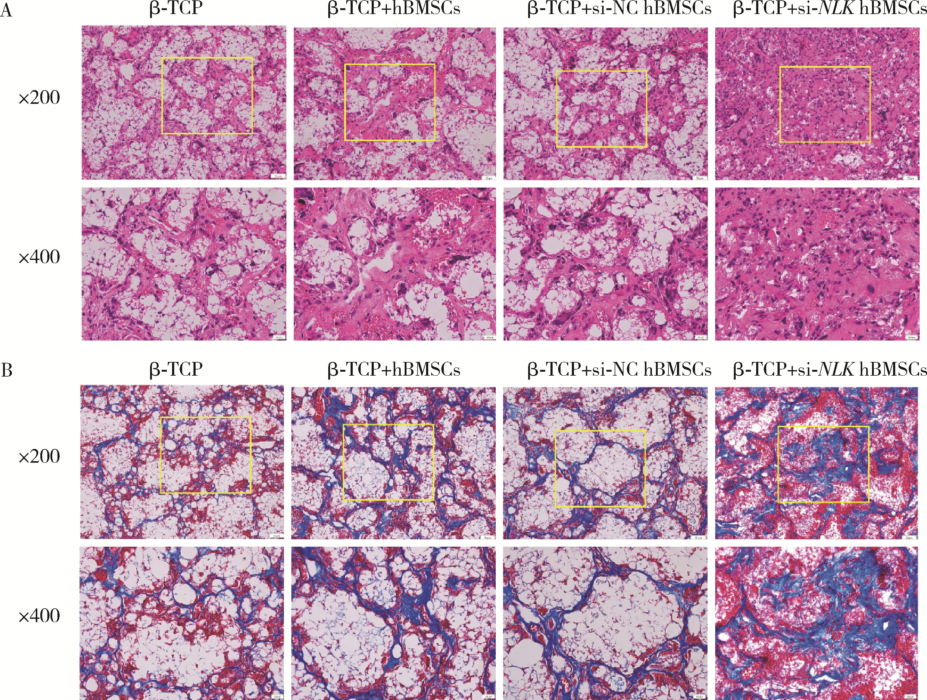 Objective: To identify the role of gene silencing or overexpression of Nemo-like kinase (NLK) during the process of neural differentiation of human mesenchymal stem cells (hBMSCs), and to explore the effect of NLK downregulation by transfection of small interfering RNA (siRNA) on promoting neuralized tissue engineered bone regeneration. Methods: NLK-knockdown hBMSCs were established by transfection of siRNA (the experimental group was transfected with siRNA silencing the NLK gene, the control group was transfected with control siRNA and labeled as negative control group), and NLK-overexpression hBMSCs were established using lentivirus vector transfection technique (the experimental group was infected with lentivirus overexpressing the NLK gene, the control group was infected with an empty vector lentivirus and labeled as the empty vector group). After neurogenic induction, quantitative real-time polymerase chain reaction (qPCR) was used to detect the expression of neural-related gene, and Western blot as well as immunofluorescence staining about several specific neural markers were used to evaluate the neural differentiation ability of hBMSCs.6-week-old male nude mice were divided into 4 groups: ① β-tricalcium phosphate (β-TCP) group, ② β-TCP+ osteogenic induced hBMSCs group, ③ β-TCP+ siRNA-negative control (siRNA-NC) transfection hBMSCs group, ④ β-TCP+ siRNA-NLK transfection hBMSCs group. Four weeks after the subcutaneous ectopic osteogenesis models were established, the osteogenesis and neurogenesis were detected by hematoxylin-eosin (HE) staining, Masson staining and tissue immunofluorescence assay. Statistical analysis was conducted by independent sample t test. Results: After gene silencing of NLK by siRNA in hBMSCs, neural-related genes, including the class Ⅲ β-tubulin (TUBB3), microtubule association protein-2 (MAP2), soluble protein-100 (S100), nestin (NES), NG2 proteoglycan (NG2) and calcitonin gene-related peptide (CGRP), were increased significantly in NLK-knockdown hBMSCs compared with the negative control group(P < 0.05), and the expression levels of TUBB3 and MAP2 of the NLK silencing group were also increased. Oppositely, after NLK was overexpressed using lentivirus vector transfection technique, TUBB3, MAP2, S100 and NG2 were significantly decreased in NLK-overexpression hBMSCs compared with the empty vector group (P < 0.05), and the expression level of TUBB3 was also decreased. 4 weeks after the subcutaneous ectopic osteogenesis model was established, more mineralized tissues were formed in the β-TCP+ siRNA-NLK transfection hBMSCs group compared with the other three groups, and the expression of BMP2 and S100 was higher in the β-TCP+ siRNA-NLK transfection hBMSCs group than in the other groups. Conclusion: Gene silencing of NLK by siRNA promoted the ability of neural differentiation of hBMSCs in vitro and promoted neuralized tissue engineered bone formation in subcutaneous ectopic osteogenic models in vivo in nude mice.