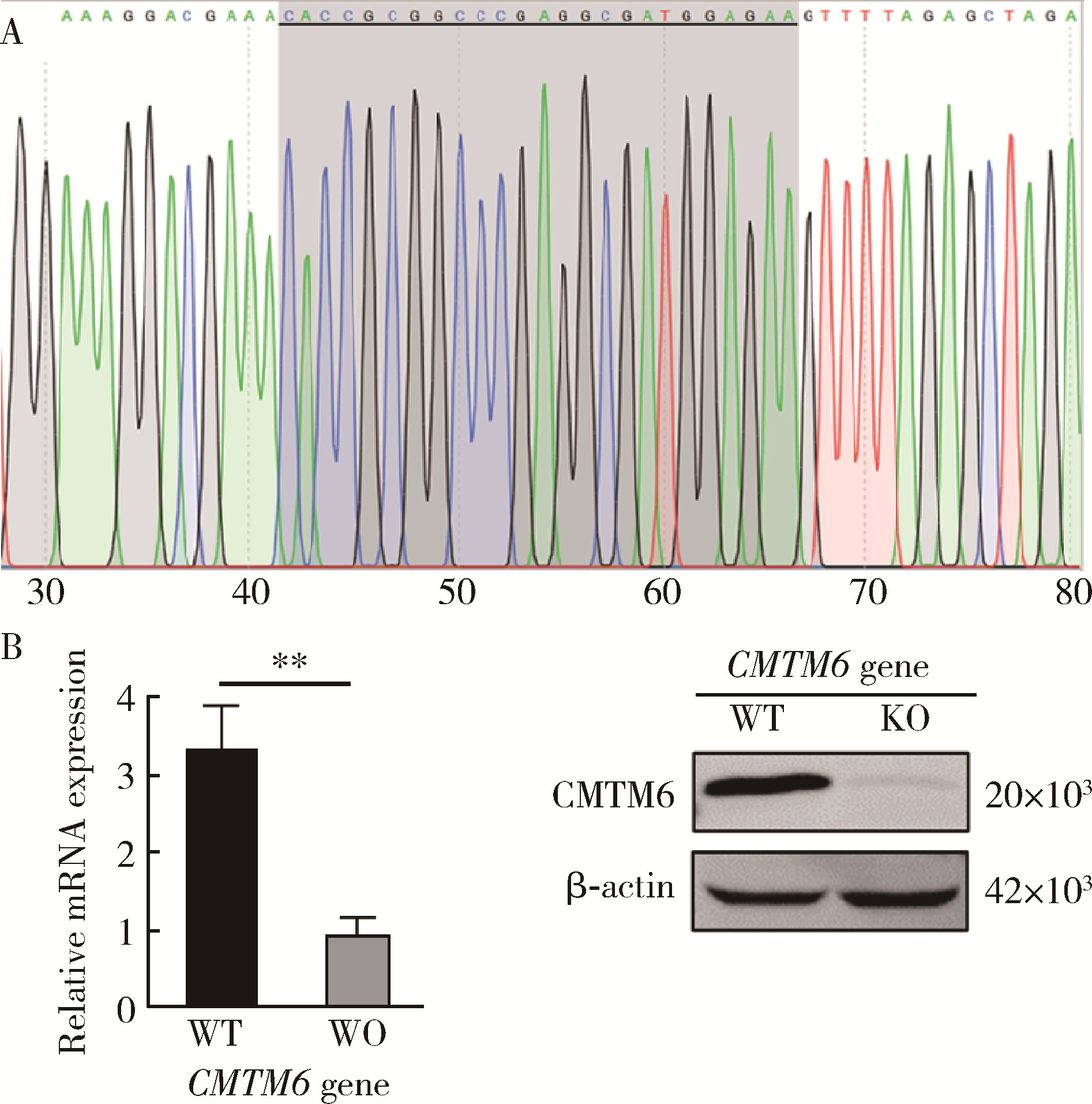 RT-qPCR及Western blot检测Hp 26695感染前后CMTM6基因野生型和敲除GES-1细胞CMTM6、PD-L1的mRNA及蛋白表达"