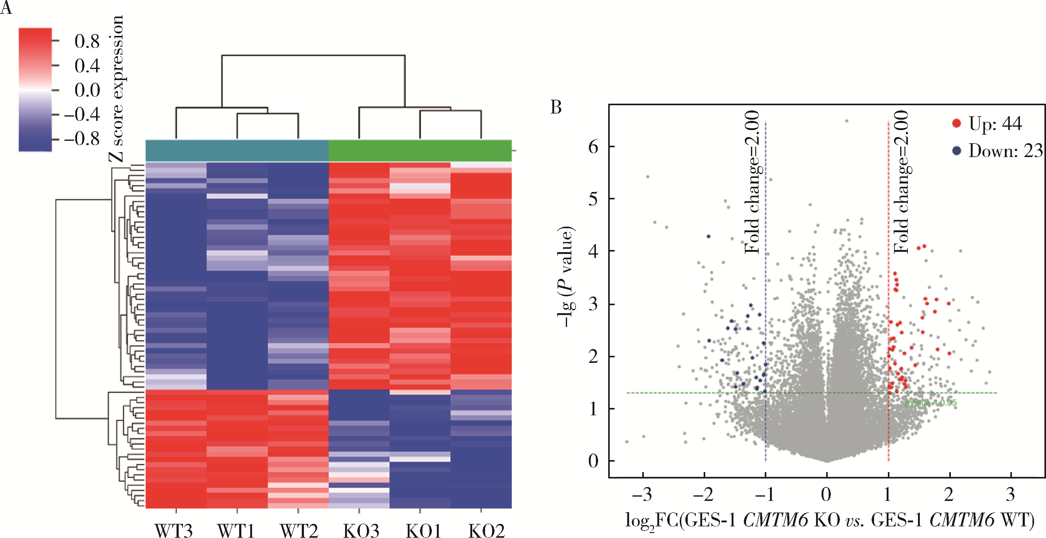 CMTM6基因敲除和野生型GES-1差异表达基因聚类分析及火山图"