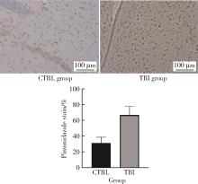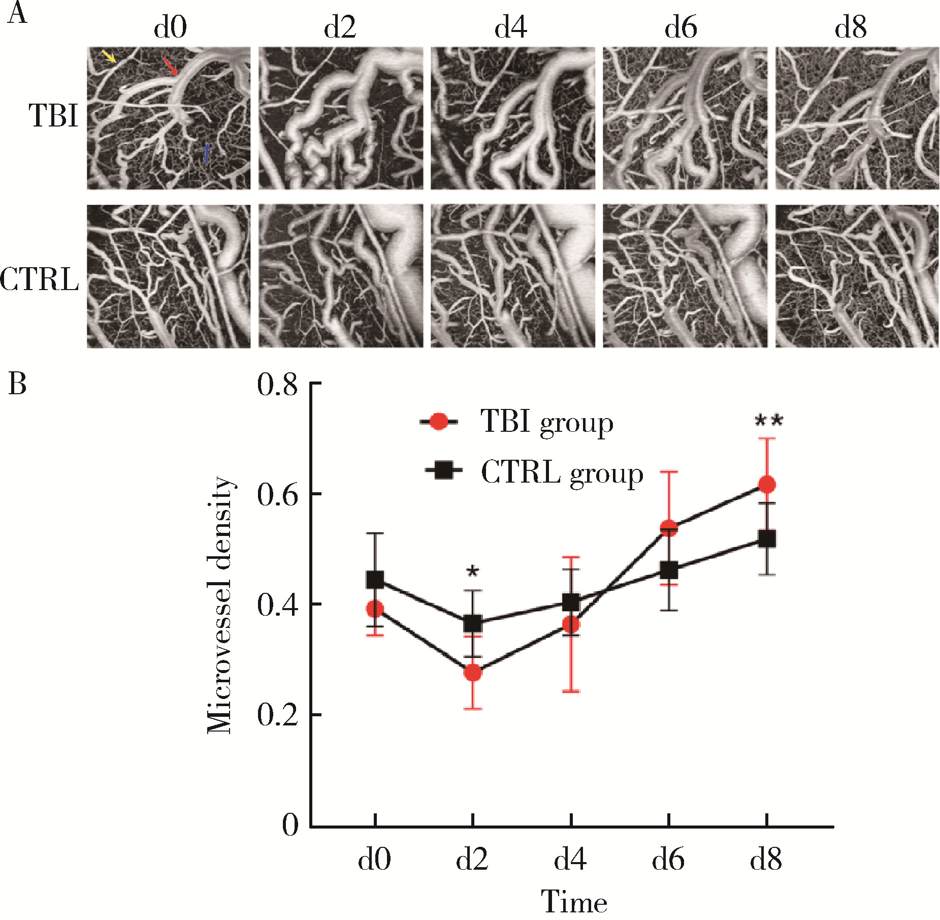 目的: 观察创伤性脑损伤(traumatic brain injury, TBI)大鼠急性期创伤半暗带内微血管损伤与修复的动态变化。方法: 重物坠落致去颅骨骨瓣大鼠TBI后置入封闭式透明颅窗,并设对照组。术后第0、2、4、6、8天经颅窗行光学相干断层血管造影(optical coherence tomography angiography, OCTA)成像,第1天行头部MRI检查,第2天行脑组织哌莫硝唑免疫组织化学检测。结果: MRI T2W1和免疫组织化学检测结果均显示创伤脑组织水肿和缺氧深达脑皮质全层,OCTA示TBI组和对照组两组大鼠术后脑皮质表面静脉均显著扩张迂曲,第8天恢复。TBI组有效灌注微血管密度由第0天的39.38%±4.48%最低降至第2天的27.84%±6.01%,显著低于第0、6、8天(P < 0.05);第8天最高达61.71%±7.69%,显著高于第0、2、4天(P < 0.05);TBI组有效灌注微血管密度第2天显著低于对照组(P=0.021),第8天则显著高于对照组(P=0.030)。结论: OCTA可作为TBI大鼠损伤脑皮质有效灌注微血管成像和计量方法,TBI后创伤半暗带内有效灌注微血管密度降低后逐渐恢复,在第8天显著增加。