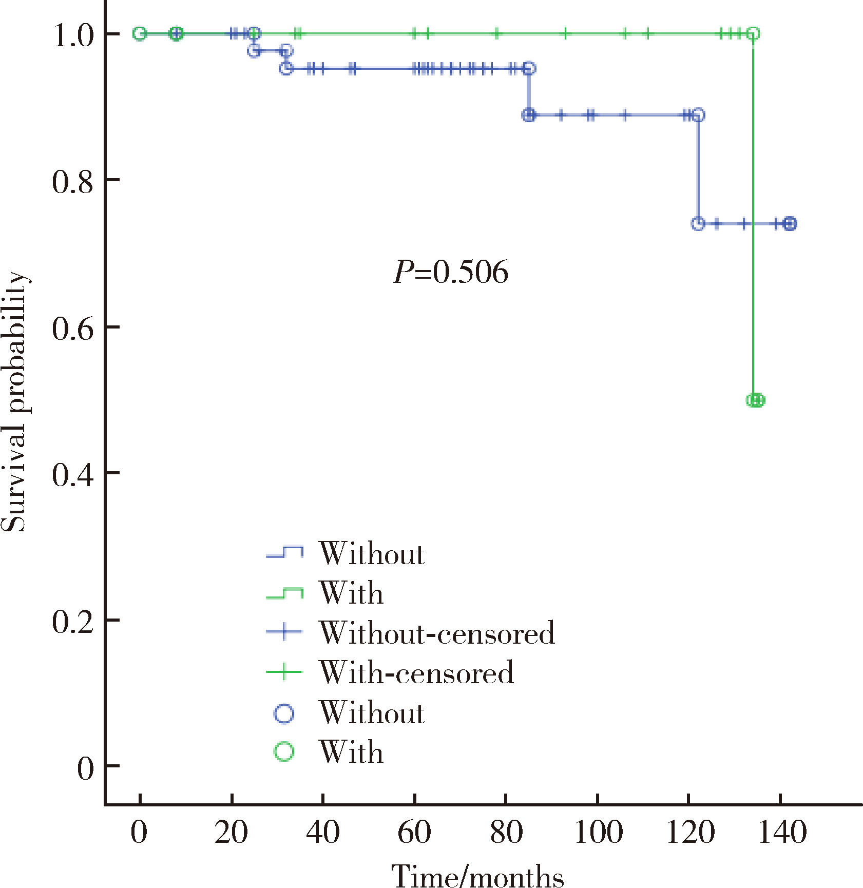 目的: 探讨术中回收式自体输血对颈动脉体瘤切除术后肿瘤局部复发和远期转移的影响。方法: 选择2009年8月至2020年12月在北京大学人民医院血管外科择期行颈动脉体瘤切除术的患者共61例进行回顾性分析, 其中使用术中回收式自体输血者14例, 未使用者47例。收集患者的一般资料、手术情况以及术后随访结果, 分析比较术中自体输血对颈动脉体瘤切除术后患者肿瘤预后的影响。结果: 自体输血组Shamblin Ⅲ型占比85.7%, 显著高于非自体输血组的31.9%(P=0.003)。14例自体输血的患者中, 8例(57%)需同时使用异体血; 而47例非自体输血患者, 6例(13%)需要使用异体血输血, 自体输血组同时使用异体血的比例更高(P =0.002)。术后30 d内神经损伤发生率29.5%, 组间差异无统计学意义。没有发生早期死亡病例。平均随访(76±37)个月, 局部复发1例, 发生于非自体输血组。没有远处转移, 没有肿瘤相关死亡。估计5年总体生存率96.4%, 10年总体生存率83.8%。两组之间总体生存率差异无统计学意义(P =0.506)。结论: 使用术中回收式自体输血不会增加颈动脉体瘤切除术后局部复发和远处转移的风险。