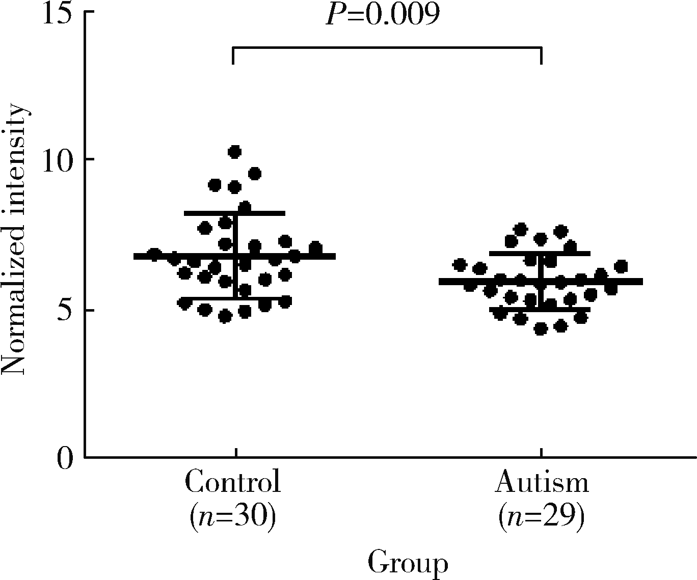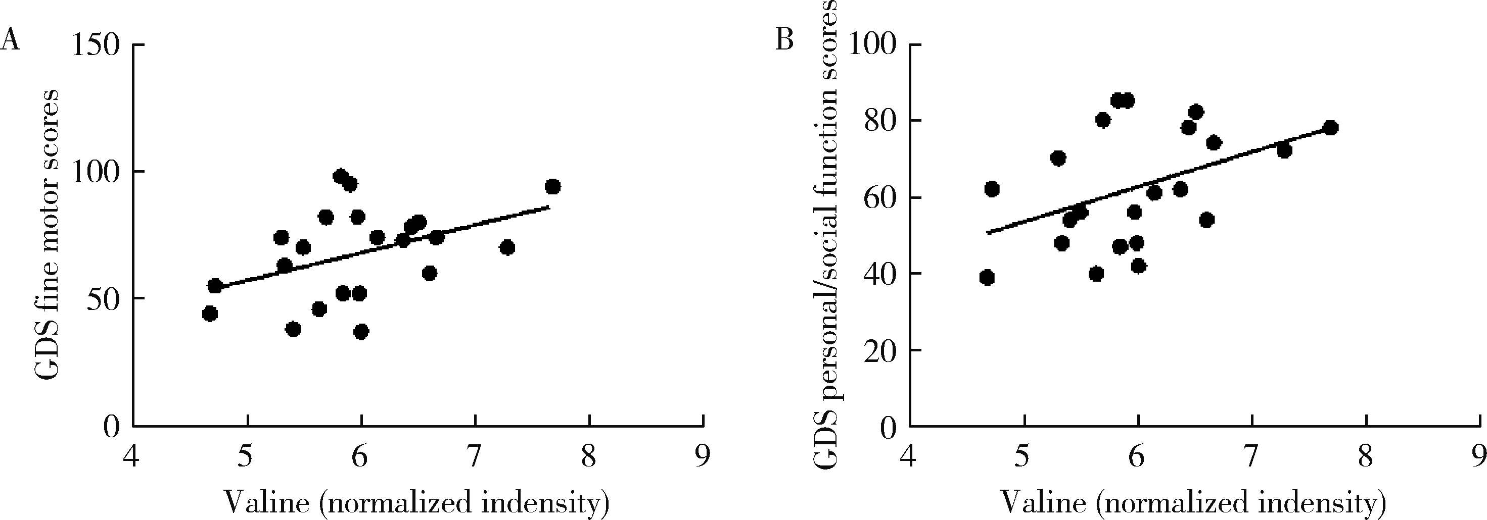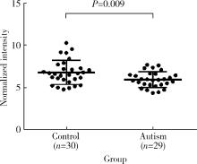 目的: 比较孤独症儿童与健康儿童血浆中缬氨酸水平的差异, 并探究孤独症儿童血浆缬氨酸水平与其发育商评分的相关性。方法: 共招募29例孤独症儿童作为病例组, 同期招募30例同年龄段的正常儿童作为对照组。采用儿童孤独症评定量表(childhood autism rating scale, CARS)对孤独症儿童的核心症状及其严重程度进行评估, 采用Gesell发育量表(Gesell developmental schedules, GDS)评估儿童发育商, 采用高效液相色谱-串联质谱法测定血浆缬氨酸水平, 并比较两组间差异, 分析病例组儿童血浆缬氨酸水平与其发育商评分间的相关性。结果: 与对照组相比, 孤独症组血浆缬氨酸水平显著偏低, 差异有统计学意义(P<0.05)。在GDS量表因子得分方面, 孤独症组儿童在适应性、大运动、精细运动、语言、个人-社交等方面的得分均显著低于对照组儿童, 差异均有统计学意义(P<0.000 1)。孤独症组儿童血浆缬氨酸水平与GDS量表中的精细运动评分(r=0.441, P<0.05)和个人-社交评分(r=0.437, P<0.05)均呈显著正相关, 但与适应性、大运动和语言方面的评分无显著相关(P>0.05)。根据CARS量表评分标准, 将孤独症组儿童根据病情严重程度分为轻中度和重度两个亚组, 在亚组之间进行比较发现, 重度孤独症儿童在GDS量表适应性、精细运动、语言以及个人-社交方面的评分均显著低于轻中度孤独症儿童(P<0.05), 而两个亚组之间在GDS量表大运动评分及血浆缬氨酸水平方面差异均无统计学意义(P>0.05)。结论: 孤独症儿童血浆中缬氨酸水平偏低, 且与其精细运动和个人-社交功能之间存在一定关联。