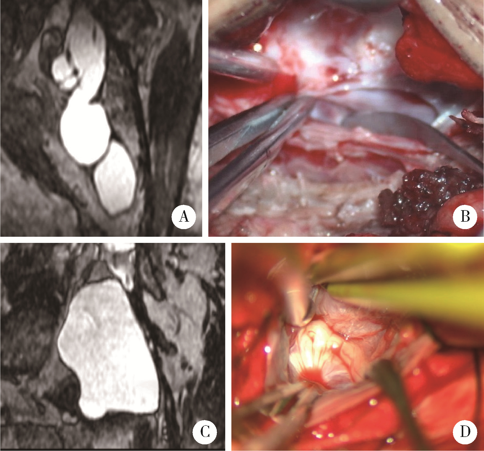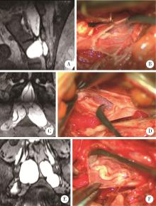 目的: 运用任意维度重建磁共振对骶管囊肿进行精准分型, 有效指导患者的微创手术和术后个性化康复。方法: 2021年3—12月, 应用任意维度重建磁共振评估骶管囊肿患者的围手术期状况, 根据神经根或漏口轨迹重建出囊肿内神经根走行和囊肿漏口情况, 对骶管囊肿进行精准分型并精准设计手术切口和骶管后壁骨窗范围。于显微镜下验证术前分型的准确性, 指导对应术式治疗不同类型的骶管囊肿。术后复查神经根水肿情况、术腔是否有积液等, 制定患者个性化的康复方案, 便于患者顺利康复。结果: 92例骶管囊肿患者中, 58例(63.0%)为内含神经根囊肿, 29例(31.5%)为内无神经根囊肿, 5例(5.4%)为混合型骶管囊肿。58例内含神经根囊肿的患者中, 手术显微镜下复核影像临床分型的准确度可达96.6% (56/58), 只有2例较大的单发囊肿、神经根在囊肿上极闪现被误认为内无神经根型。29例内无神经根的骶管囊肿患者中, 显微镜下复核影像的准确度达100%。对12例复发骶管囊肿内部的神经根和漏口情况的判断准确度达到100%。术后1个月发现迟发性术腔积液2例, 予以艾灸、泡澡等康复治疗, 患者术后4~6个月积液消失。结论: 任意维度重建磁共振在术前可准确判断骶管囊肿的临床分型, 指导手术精准执行, 并个性化改善患者的康复效果。