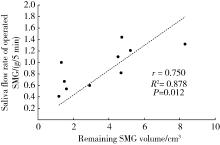 目的: 分析部分下颌下腺切除术对于下颌下腺良性肿瘤治疗的临床效果,探讨部分下颌下腺切除术的应用价值。方法: 纳入2017年10月至2021年2月于北京大学深圳医院口腔颌面外科行手术治疗的下颌下腺多形性腺瘤患者并对其进行随访评估,其中15例行部分下颌下腺切除术(部分切除组),18例行常规下颌下腺切除术(全切除组),比较两组术后唾液分泌、口干程度、面颈部容貌、神经损伤、肿瘤复发情况,并分析部分切除组健侧和患侧腺体体积、唾液流率及两者之间的相关性。结果: 两组患者在随访期内均未见肿瘤复发。部分切除组及全切除组术后静息全唾液流率分别为(2.15±1.10) g/5 min及(1.35±0.97) g/5 min,差异有统计学意义(t=2.208,P=0.035),口干症状部分切除组较全切除组轻(Z=-2.244,P=0.025);在部分切除组中,同一患者健侧和患侧下颌下腺静息唾液流率分别为(1.18±0.40) g/5 min及(0.92±0.40) g/5 min,差异有统计学意义(t=-2.821,P=0.014),而当患侧腺体剩余80%以上时,健侧和患侧静息唾液流率差异无统计学意义(t=-0.027,P=0.980),单位体积腺体唾液流率健侧和患侧差异无统计学意义(t=-0.015,P=0.989),剩余腺体的体积与唾液流率呈正相关(r=0.750,P=0.012)。部分切除组术后容貌满意度略高于全切除组,但差异无统计学意义;两组术后均未出现神经损伤症状。结论: 部分下颌下腺切除术在根治良性肿瘤的同时保留腺体分泌功能,并发症更少,可以提高患者生活质量。