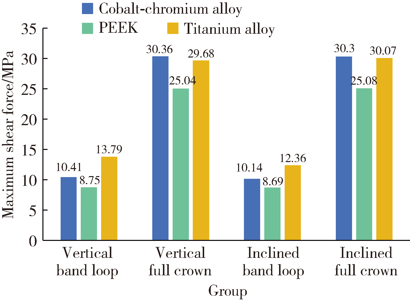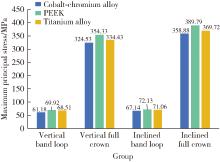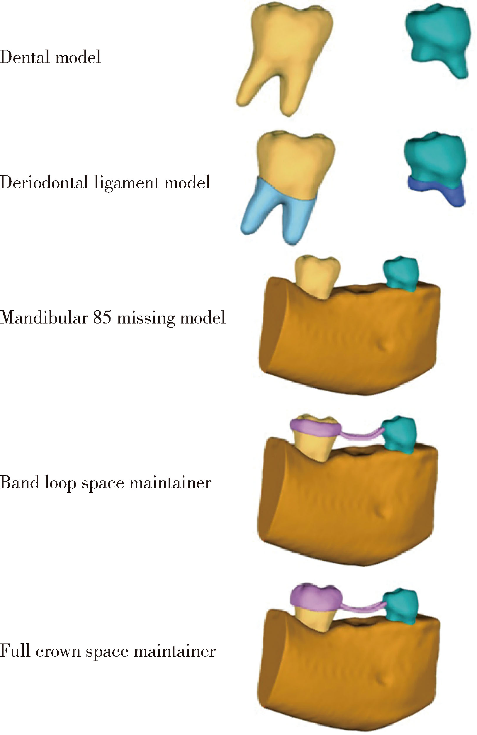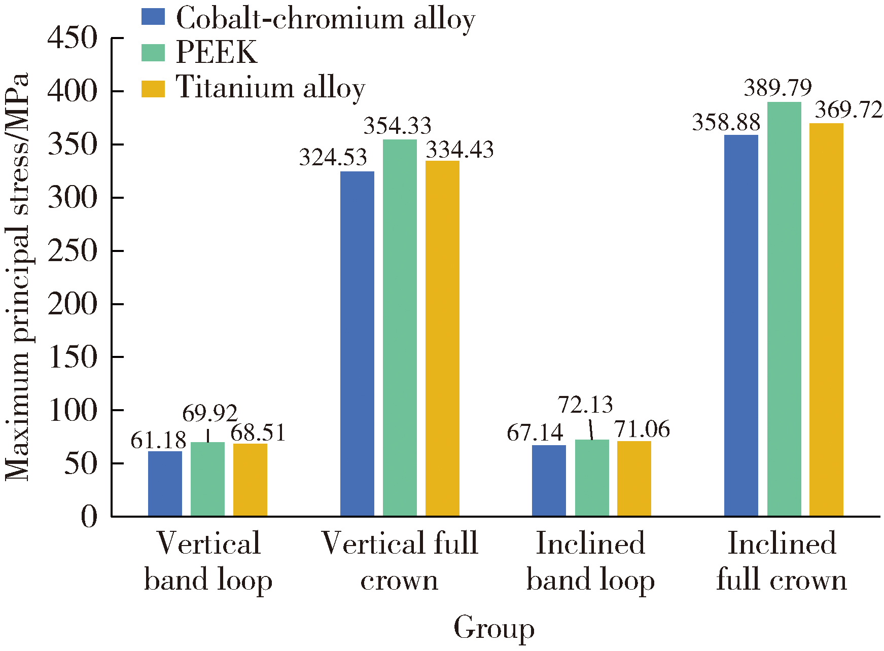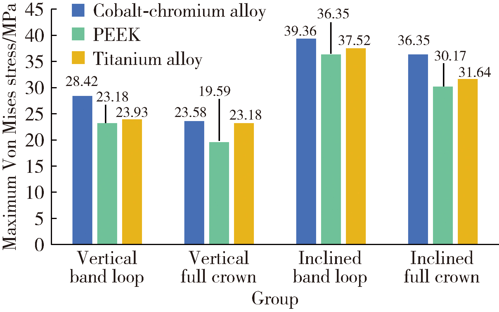 目的: 建立下颌骨及乳牙缺失数字化丝圈间隙保持器的三维有限元模型,以探讨下颌第二乳磨牙缺失患者佩戴丝圈间隙保持器时的应力、变形及剪切力情况。方法: 通过对患儿进行锥形束CT(cone beam computed tomography,CBCT)扫描,使用Mimics 21.0软件建立下颌第二乳磨牙缺失的数字模型。利用儿童丝圈间隙保持器设计软件构建冠部固位与丝圈结构一体化的全冠及带环丝圈间隙保持器的数字模型,并分别采用钴铬合金、聚醚醚酮(polyether ether ketone,PEEK)及钛合金三种材料进行构建。在ANSYS Work Beach 2023 R2软件中,对模型46和84的咬合面施加垂直和沿牙体长轴倾斜45°的70 N载荷,以及丝圈上表面10 N载荷,模拟患儿佩戴丝圈间隙保持器时的正中咬合与侧方咬合,分析丝圈间隙保持器及基牙的受力情况。结果: 在不同的加载条件下,带环丝圈间隙保持器的最大主应力明显低于全冠丝圈间隙保持器。应力云图显示,最大主应力峰值出现在丝圈末端与冠部结构连接处,表明这一部位更容易发生断裂;使用PEEK材料制作的带环丝圈间隙保持器内部组织面的最大剪切应力最小;46和84牙齿的等效应力(Von Mises应力)最小,分别为23.18 MPa和36.35 MPa,且最大等效应力分别位于46牙齿近中、84牙齿远中靠近牙根部与丝圈间隙保持器接触的区域。结论: 在第二乳磨牙缺失的情况下,佩戴数字化带环丝圈间隙保持器能够有效分散应力,且PEEK材料的带环丝圈间隙保持器在一定程度上降低了基牙的受力,其在临床应用中显示出一定的优越性。