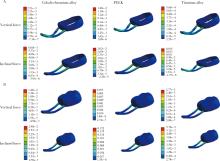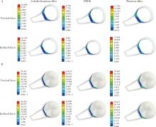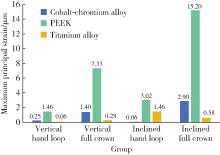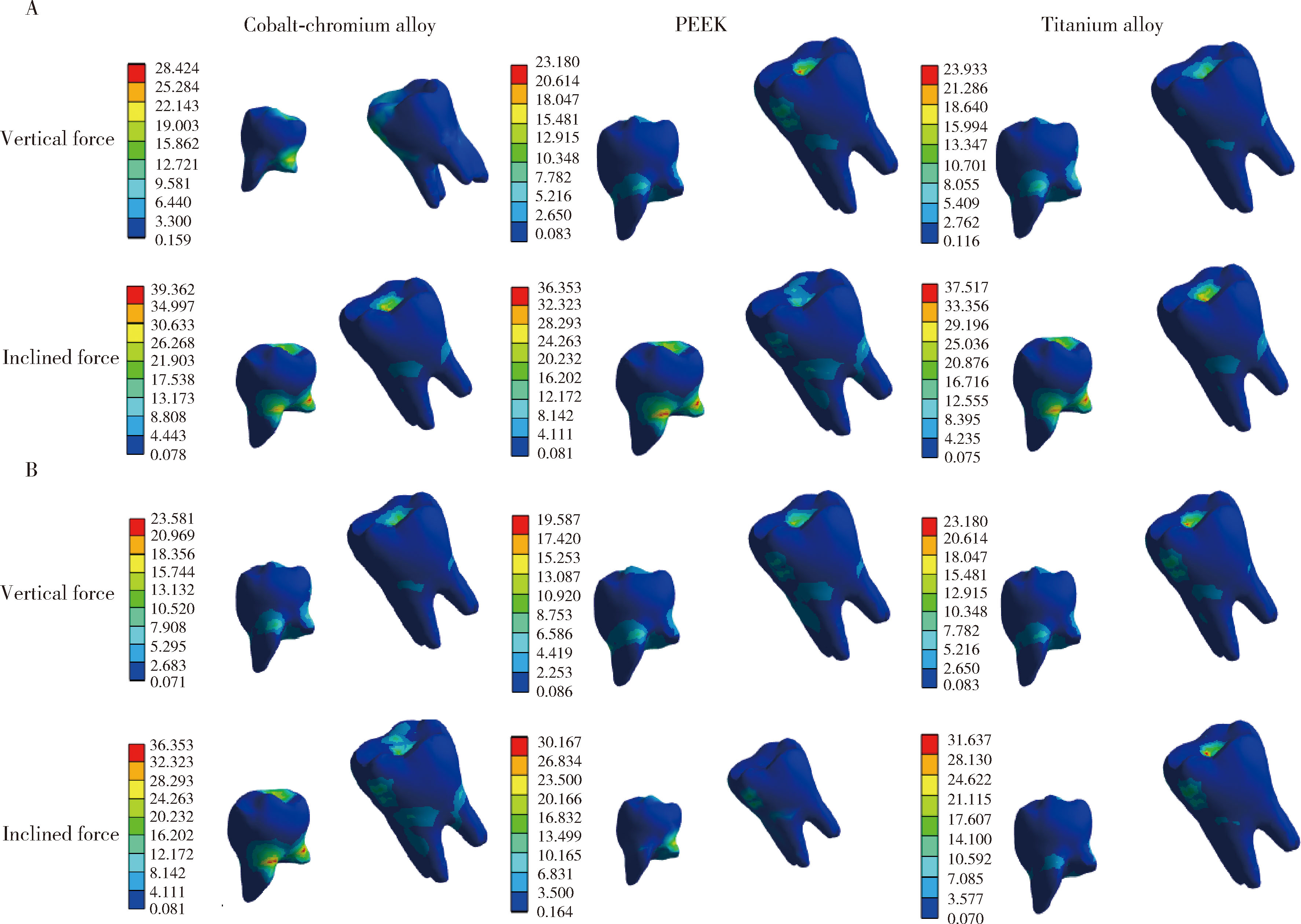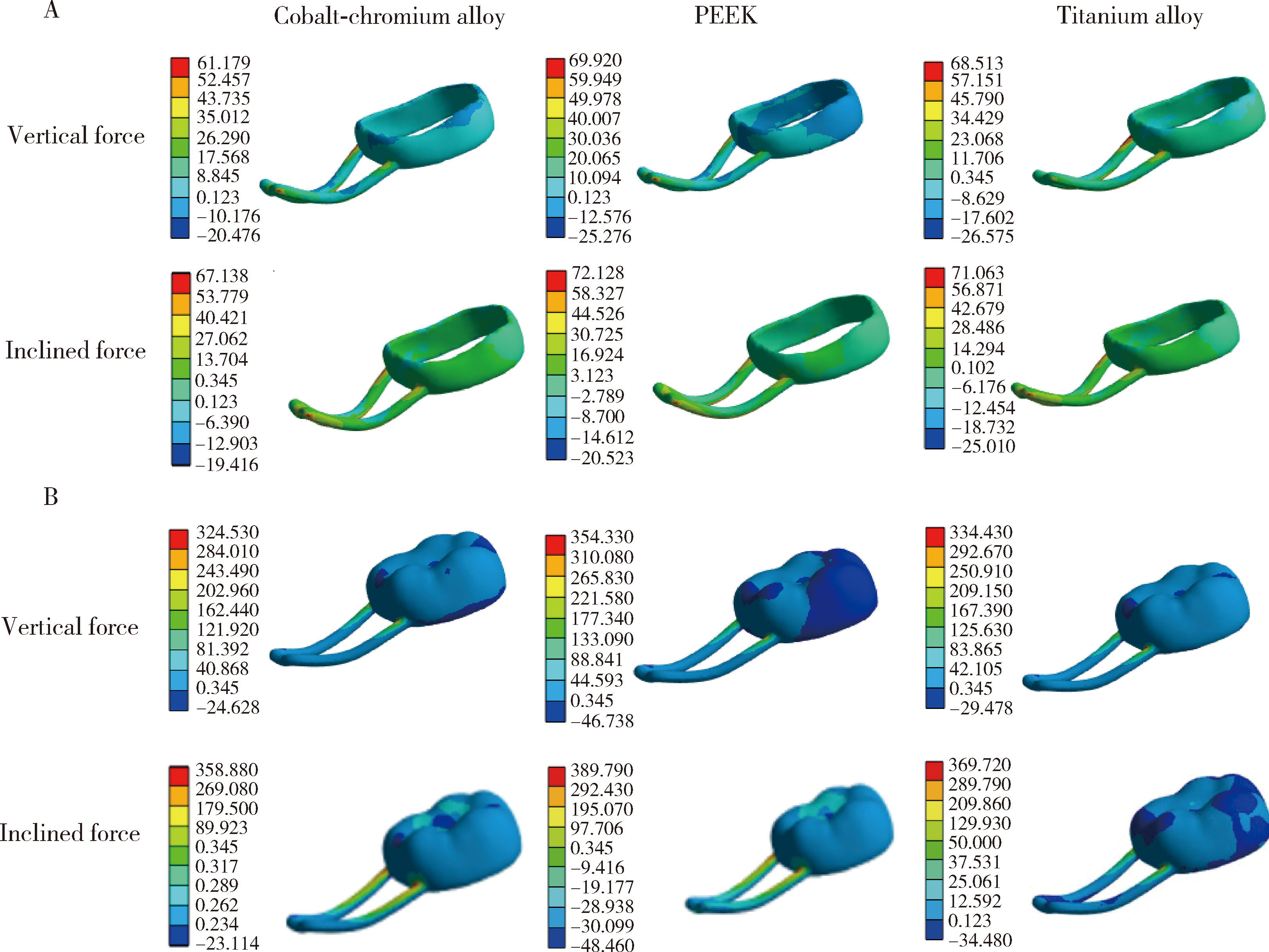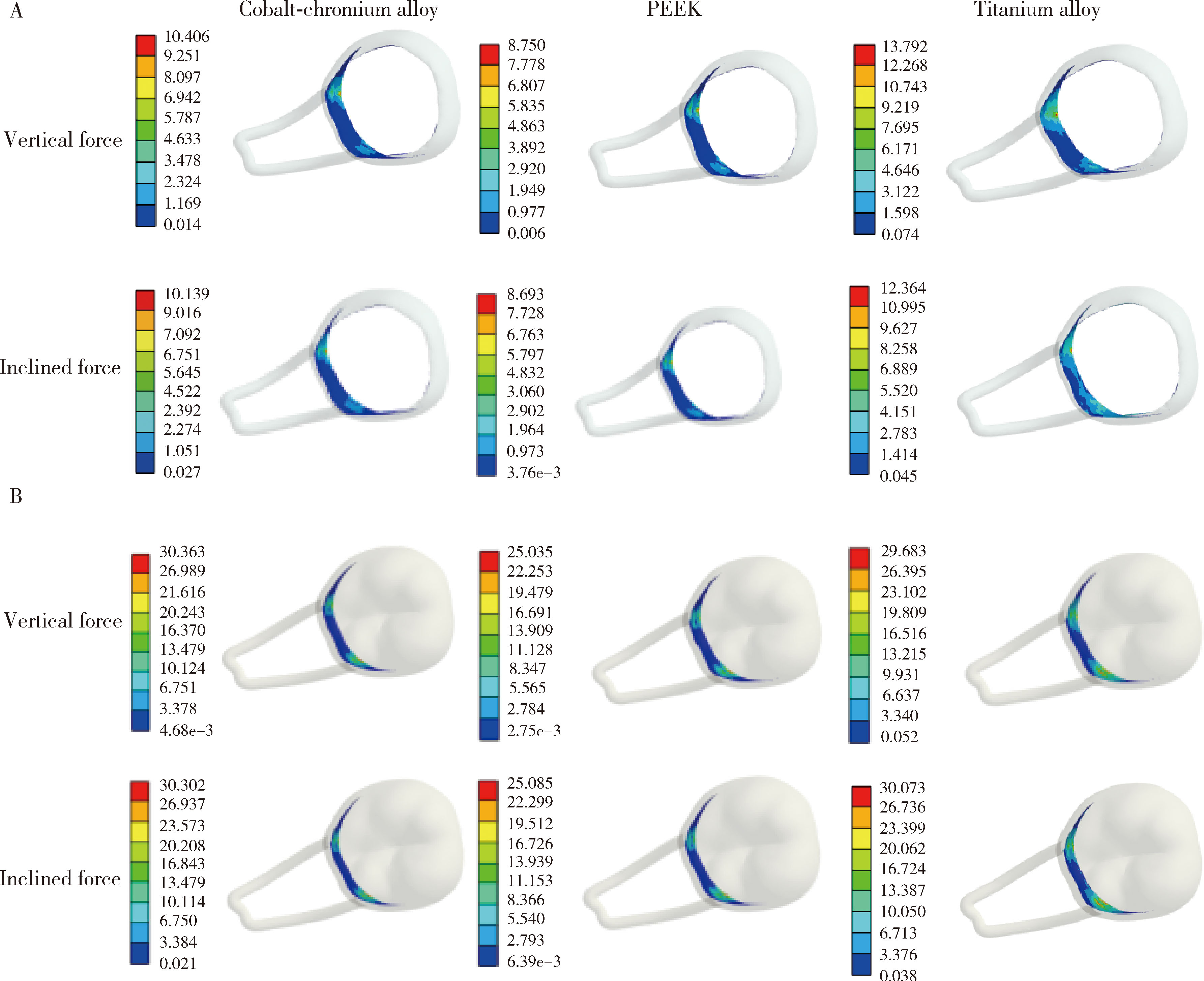 目的: 建立下颌骨及乳牙缺失数字化丝圈间隙保持器的三维有限元模型,以探讨下颌第二乳磨牙缺失患者佩戴丝圈间隙保持器时的应力、变形及剪切力情况。方法: 通过对患儿进行锥形束CT(cone beam computed tomography,CBCT)扫描,使用Mimics 21.0软件建立下颌第二乳磨牙缺失的数字模型。利用儿童丝圈间隙保持器设计软件构建冠部固位与丝圈结构一体化的全冠及带环丝圈间隙保持器的数字模型,并分别采用钴铬合金、聚醚醚酮(polyether ether ketone,PEEK)及钛合金三种材料进行构建。在ANSYS Work Beach 2023 R2软件中,对模型46和84的咬合面施加垂直和沿牙体长轴倾斜45°的70 N载荷,以及丝圈上表面10 N载荷,模拟患儿佩戴丝圈间隙保持器时的正中咬合与侧方咬合,分析丝圈间隙保持器及基牙的受力情况。结果: 在不同的加载条件下,带环丝圈间隙保持器的最大主应力明显低于全冠丝圈间隙保持器。应力云图显示,最大主应力峰值出现在丝圈末端与冠部结构连接处,表明这一部位更容易发生断裂;使用PEEK材料制作的带环丝圈间隙保持器内部组织面的最大剪切应力最小;46和84牙齿的等效应力(Von Mises应力)最小,分别为23.18 MPa和36.35 MPa,且最大等效应力分别位于46牙齿近中、84牙齿远中靠近牙根部与丝圈间隙保持器接触的区域。结论: 在第二乳磨牙缺失的情况下,佩戴数字化带环丝圈间隙保持器能够有效分散应力,且PEEK材料的带环丝圈间隙保持器在一定程度上降低了基牙的受力,其在临床应用中显示出一定的优越性。