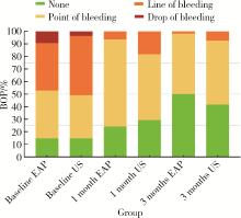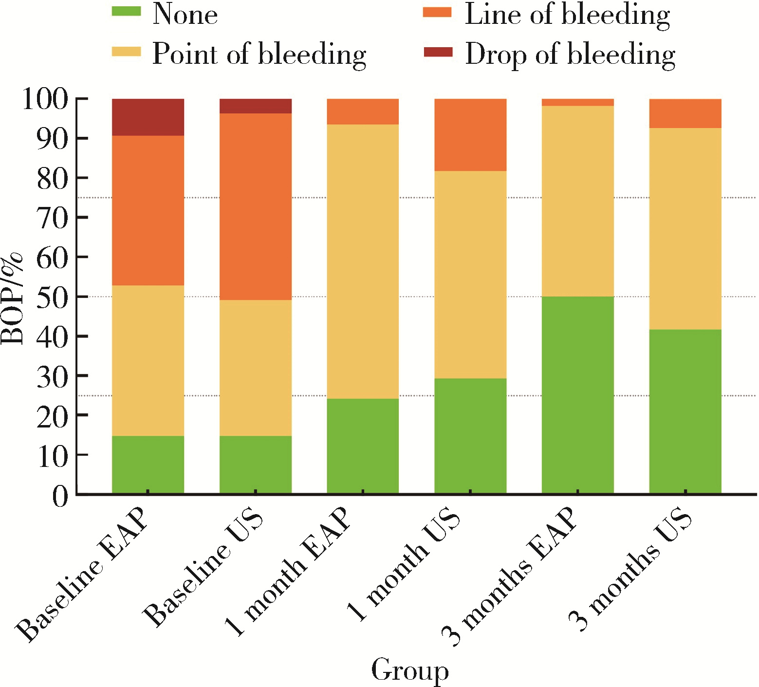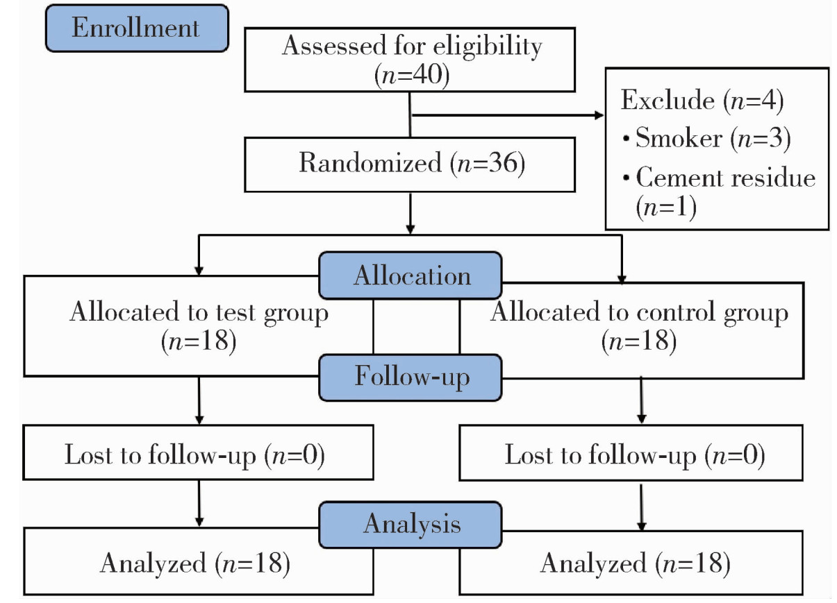 目的: 比较赤藓糖醇喷砂(erythritol air-polishing, EAP)和超声(ultrasonic debridement, US)两种方法治疗种植体周黏膜炎的短期临床疗效差异, 并评估患者报告的结局。方法: 为单盲、随机对照临床研究, 研究对象为2021年6月至2022年5月就诊于北京大学口腔医院牙周科的种植体周黏膜炎患者。共纳入36例患者(每例纳入1颗种植体), 随机分为EAP组(n=18)和US组(n=18)。分别于基线、治疗后1个月及3个月采集临床指标。主要结局指标为种植体周探诊深度(peri-implant probing depths, PPD)的变化, 次要结局指标为改良菌斑指数(modified plaque index, mPLI)、探诊出血(bleeding on probing, BOP)、探诊溢脓(suppuration on probing, SoP)、疼痛视觉模拟评分(visual analogue scale, VAS)。此外, 作为探索性分析, 还比较了两组患者PPD≥4 mm位点的比例。每次就诊均强化口腔卫生宣教, 并对种植体上部结构进行抛光。结果: EAP组和US组基线期临床指标具有可比性。对于主要结局指标平均PPD, EAP组较基线值(4.0±0.5) mm显著降低, 在治疗后1个月和3个月时分别降至(3.7±0.6) mm和(3.4±0.5) mm, 差异均具有统计学意义(P=0.011; P < 0.001);US组的平均PPD也较基线值(3.8±0.4) mm显著降低, 在治疗后1个月和3个月时分别降至(3.6±0.5) mm和(3.5±0.4) mm, 差异均具有统计学意义(P=0.038;P=0.018), 但两组间在各时间点的差异均无统计学意义(P>0.05)。次要结局指标中, 两组的平均mPLI(1、3个月均P < 0.001)与BOP(1个月P < 0.05; 3个月P < 0.001)均较基线显著改善, 治疗后VAS评分均较低, 但此三项指标的组间差异均无统计学意义(P>0.05)。治疗后3个月, EAP组PPD≥4 mm位点比例显著低于US组[(42.6±26.1)% vs.(57.4±25.1)%], 差异具有统计学意义(P=0.029)。研究期间未报告不良事件。结论: EAP与US均是治疗种植体周黏膜炎的有效方法, 总体疗效相当; 然而, 在减少深袋位点方面, EAP展现出短期潜力, 此结果尚需进一步验证。