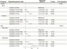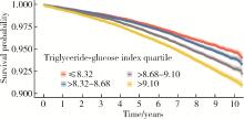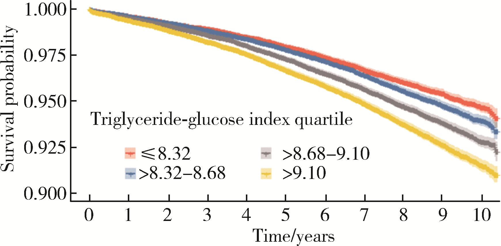 目的: 在大样本社区人群队列中探索甘油三酯-葡萄糖(triglyceride-glucose, TyG)指数与心血管病发病和死亡的关联。方法: 研究对象为2010年1月1日至2020年5月31日纳入中国鄞州电子健康档案研究(CHinese Electronic health Records Research in Yinzhou, CHERRY)队列中40~79岁基线无心血管病史的人群。根据个体的基线甘油三酯和血糖水平计算TyG指数,采用Cox比例风险模型分析TyG指数与心血管病发病和死亡的关联,调整年龄、性别、教育水平、居住地、吸烟状态、体重指数、收缩压及总胆固醇等影响因素后计算风险比(hazard ratio, HR)及其95%置信区间(confidence interval, CI)。采用限制性立方样条回归方法进一步分析TyG指数与心血管病发病和死亡的非线性关联,并按性别、年龄分层探索其关联在不同亚组的差异。结果: 共纳入226 406名研究对象,人群的基线平均年龄为(55.0±9.7)岁,46.8%为男性,TyG指数的中位数为8.68。在中位随访7.99年期间,9 815人(4.34%)出现心血管病发病和死亡。调整年龄、性别、教育水平、居住地、吸烟状态、体重指数、收缩压及总胆固醇等影响因素后,心血管病发病和死亡的风险呈现随TyG指数增加而增大的趋势(P < 0.001),TyG指数处于上四分位数(TyG>9.10)组与下四分位数组(TyG≤8.32)相比,心血管病发病和死亡的风险增加42%(HR=1.42,95%CI:1.34~1.51)。TyG指数对于60岁以下低年龄组人群的心血管病发病和死亡风险增加的效应值相比60岁及以上人群更明显(HR:1.71 vs. 1.27,P < 0.05)。限制性立方样条回归的结果进一步显示,在总人群中TyG指数与心血管病发病和死亡的关联呈现“反L型”关系(非线性趋势P < 0.001),TyG指数超过8.67阈值时心血管病发病和死亡的风险随该指数的增加而升高;但这种非线性关联的风险阈值存在性别差异,女性(8.51)低于男性(8.67)。结论: TyG指数与心血管病发病和死亡存在明显阈值效应的非线性关系,当TyG指数超过一定阈值时,心血管病发病和死亡发生的风险增加,且女性的阈值低于男性,提示后续利用TyG指数开展综合风险预测与危险因素干预时,需要按性别分层管理,特别是在60岁以下人群中开展早期干预具有重要的公共卫生学意义。