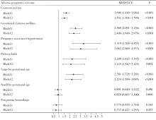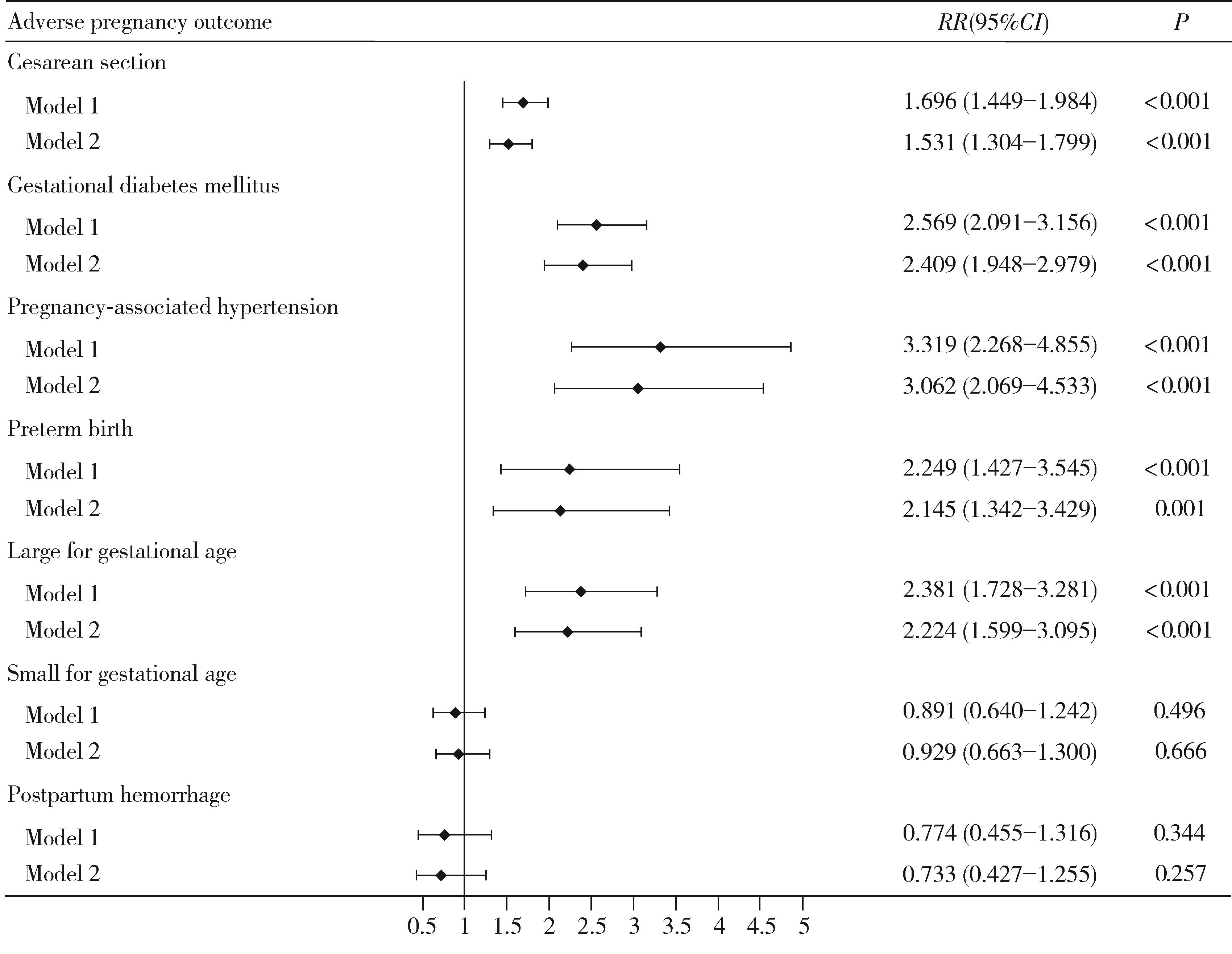 目的: 探讨代谢相关脂肪性肝病(metabolic dysfunction-associated steatotic liver disease, MASLD)与不良妊娠结局的相关性, 并分析心脏代谢风险指标(cardiometabolic risk factor, CMRF)异常的种类及其严重程度对该相关性的影响。方法: 采用回顾性队列研究, 选择2020年3月10日至2022年12月31日在首都医科大学附属北京友谊医院产科建档的单胎初产孕妇, 共纳入2 623名孕妇。记录基本信息和分娩结局, 并进行肝脏超声检查及相关产前检查, 对不良妊娠结局进行诊断。采用修正Poisson回归方法分析MASLD及其不同CMRF异常种类与不良妊娠结局的相关性, 并探究MASLD的CMRF异常程度变化与不良妊娠结局发生风险的相关性。结果: 调整年龄、孕期增重水平和受教育水平等协变量后, MASLD与剖宫产(RR=1.531, 95%CI:1.304~1.799, P < 0.001)、妊娠期糖尿病(RR=2.409, 95%CI:1.948~2.979, P < 0.001)、妊娠相关高血压(RR=3.062, 95%CI: 2.069~4.533, P < 0.001)、早产(RR=2.145, 95%CI: 1.342~3.429, P=0.001)和大于胎龄儿(RR=2.224, 95%CI: 1.599~3.095, P < 0.001)的风险升高相关。在控制其他种类CMRF异常的影响后, 不同CMRF异常MASLD孕妇的不良妊娠结局风险存在差异, 体重指数异常组的剖宫产、妊娠期糖尿病、妊娠相关高血压、早产和大于胎龄儿风险升高;血糖异常组的妊娠期糖尿病风险升高;血压异常组的妊娠相关高血压风险升高;高密度脂蛋白胆固醇异常组的剖宫产、妊娠期糖尿病和妊娠相关高血压风险升高;甘油三酯异常组的妊娠期糖尿病和早产风险升高。随着CMRF异常程度的加重, MASLD孕妇的剖宫产、妊娠期糖尿病、妊娠相关高血压、早产和大于胎龄儿风险持续升高(P均 < 0.05)。结论: 妊娠期MASLD与多种不良妊娠结局风险升高相关, 且MASLD的CMRF异常种类及严重程度对该相关性存在影响, 这提示在诊断MASLD时关注CMRF异常的具体情况, 有助于实施针对性干预并降低不良妊娠结局的发生风险。