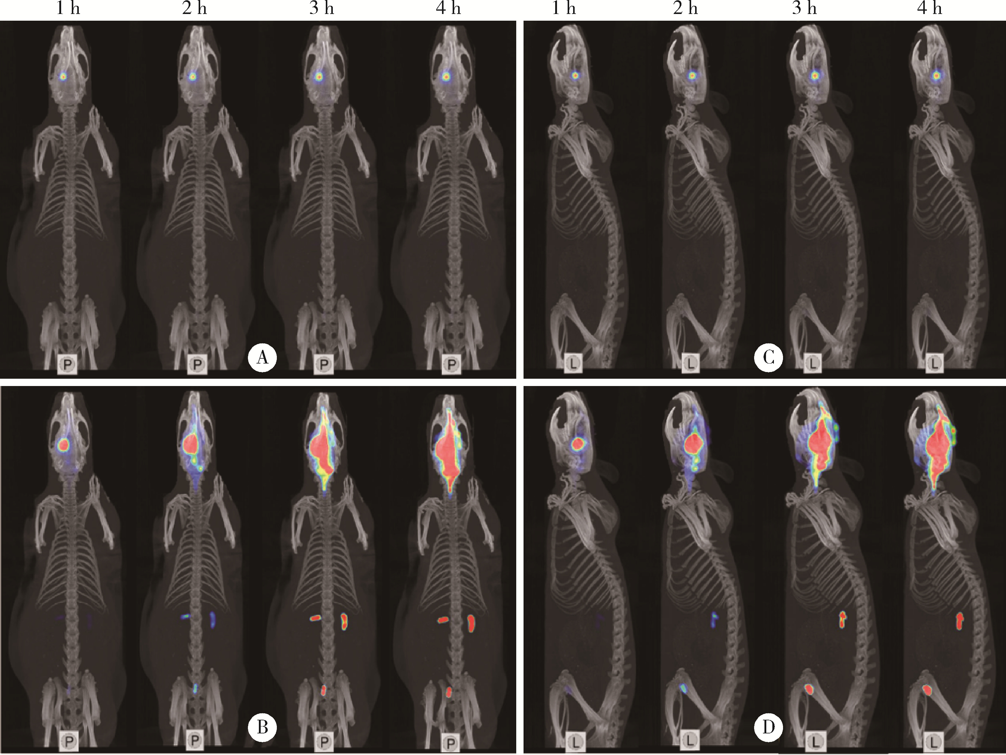 目的: 探索 99mTc-二乙基三胺五乙酸(99mTc-DTPA)经脑细胞外间隙(extracellular space, ECS)途径在不同脑区给药后,正常成年大鼠脑内及全身的药物动态分布及消除规律。方法: 使用鼠脑立体定位仪将SD大鼠固定,将体积为2 μL、放射性活度为3.7 MBq (100 μCi) 的 99mTc-DTPA分别注入大鼠的尾状核区和丘脑区,使用小动物单光子发射型计算机断层扫描/计算机断层扫描(single photon emission computed tomography/computed tomography, SPECT/CT)在不同时间显像,连续观察示踪剂的动态分布和消除规律。生物体内分布实验是在大鼠丘脑区和尾状核区注入 99mTc-DTPA,4 h后处死大鼠,收集血液、尿液,取大脑、小脑、心、肝、脾、肺、肾,称重后用γ计数器测定其放射性强度。结果: 99mTc-DTPA经脑ECS途径给药后,放射性分布浓聚于脑、肾和膀胱,左侧尾状核区给药的示踪剂优先向右侧小脑引流,右侧尾状核区给药的示踪剂优先向左侧小脑引流,尾状核区给药存在“对侧小脑优势引流”现象,而丘脑区给药后会优先向同侧小脑引流。给药4 h后,尿液、小脑和大脑出现高放射性摄取,其次是血液和肾,心、肝、脾、肺的放射性摄取值均较低,主要经泌尿系统排泄。结论: 经脑ECS途径给药是一种极具前景的给药方法,但不同脑区经该途径给药后的动态分布与消除规律存在明显差异,本研究进一步拓展了“脑分区”的内容与意义,也为未来经脑ECS途径给药进行脑病治疗和新药研发提供了理论基础。