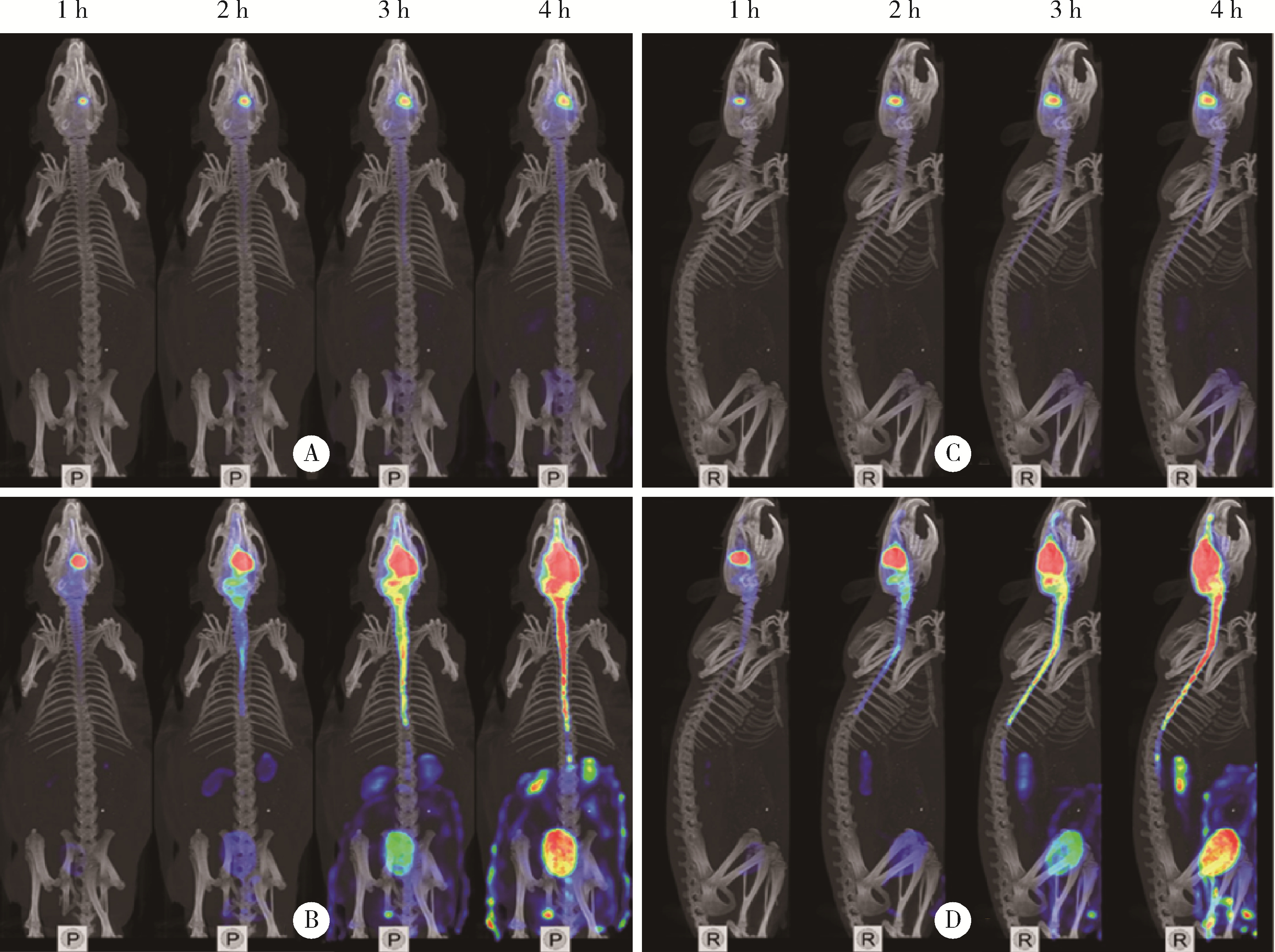 目的: 探索 99mTc-二乙基三胺五乙酸(99mTc-DTPA)经脑细胞外间隙(extracellular space, ECS)途径在不同脑区给药后,正常成年大鼠脑内及全身的药物动态分布及消除规律。方法: 使用鼠脑立体定位仪将SD大鼠固定,将体积为2 μL、放射性活度为3.7 MBq (100 μCi) 的 99mTc-DTPA分别注入大鼠的尾状核区和丘脑区,使用小动物单光子发射型计算机断层扫描/计算机断层扫描(single photon emission computed tomography/computed tomography, SPECT/CT)在不同时间显像,连续观察示踪剂的动态分布和消除规律。生物体内分布实验是在大鼠丘脑区和尾状核区注入 99mTc-DTPA,4 h后处死大鼠,收集血液、尿液,取大脑、小脑、心、肝、脾、肺、肾,称重后用γ计数器测定其放射性强度。结果: 99mTc-DTPA经脑ECS途径给药后,放射性分布浓聚于脑、肾和膀胱,左侧尾状核区给药的示踪剂优先向右侧小脑引流,右侧尾状核区给药的示踪剂优先向左侧小脑引流,尾状核区给药存在“对侧小脑优势引流”现象,而丘脑区给药后会优先向同侧小脑引流。给药4 h后,尿液、小脑和大脑出现高放射性摄取,其次是血液和肾,心、肝、脾、肺的放射性摄取值均较低,主要经泌尿系统排泄。结论: 经脑ECS途径给药是一种极具前景的给药方法,但不同脑区经该途径给药后的动态分布与消除规律存在明显差异,本研究进一步拓展了“脑分区”的内容与意义,也为未来经脑ECS途径给药进行脑病治疗和新药研发提供了理论基础。