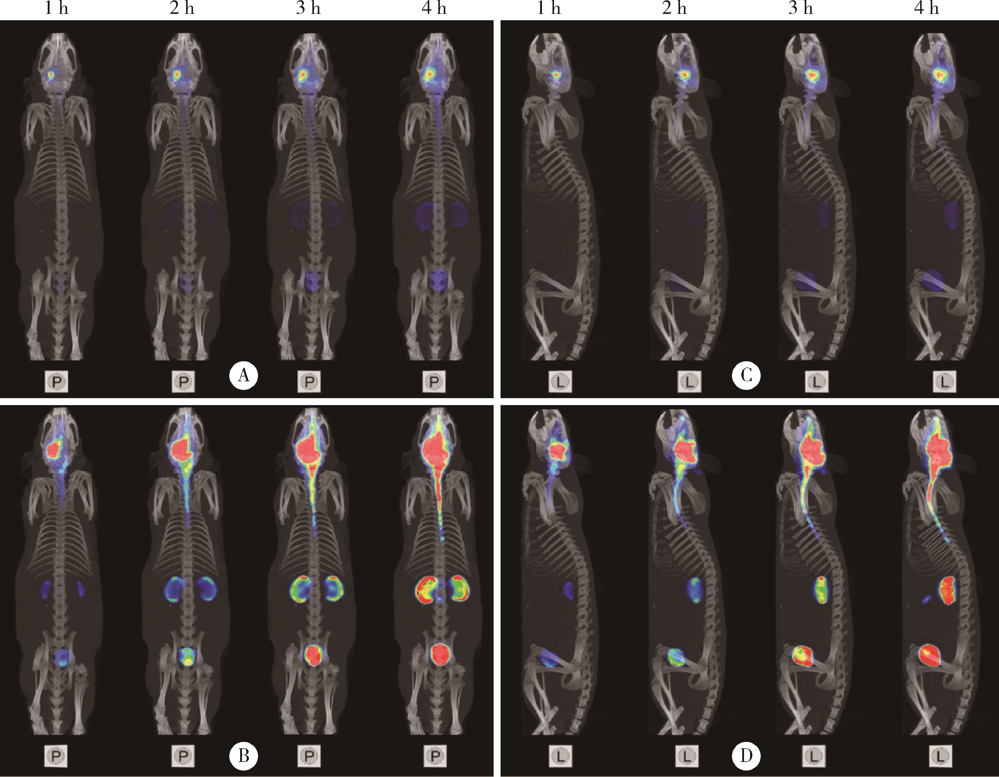 目的: 探索 99mTc-二乙基三胺五乙酸(99mTc-DTPA)经脑细胞外间隙(extracellular space, ECS)途径在不同脑区给药后,正常成年大鼠脑内及全身的药物动态分布及消除规律。方法: 使用鼠脑立体定位仪将SD大鼠固定,将体积为2 μL、放射性活度为3.7 MBq (100 μCi) 的 99mTc-DTPA分别注入大鼠的尾状核区和丘脑区,使用小动物单光子发射型计算机断层扫描/计算机断层扫描(single photon emission computed tomography/computed tomography, SPECT/CT)在不同时间显像,连续观察示踪剂的动态分布和消除规律。生物体内分布实验是在大鼠丘脑区和尾状核区注入 99mTc-DTPA,4 h后处死大鼠,收集血液、尿液,取大脑、小脑、心、肝、脾、肺、肾,称重后用γ计数器测定其放射性强度。结果: 99mTc-DTPA经脑ECS途径给药后,放射性分布浓聚于脑、肾和膀胱,左侧尾状核区给药的示踪剂优先向右侧小脑引流,右侧尾状核区给药的示踪剂优先向左侧小脑引流,尾状核区给药存在“对侧小脑优势引流”现象,而丘脑区给药后会优先向同侧小脑引流。给药4 h后,尿液、小脑和大脑出现高放射性摄取,其次是血液和肾,心、肝、脾、肺的放射性摄取值均较低,主要经泌尿系统排泄。结论: 经脑ECS途径给药是一种极具前景的给药方法,但不同脑区经该途径给药后的动态分布与消除规律存在明显差异,本研究进一步拓展了“脑分区”的内容与意义,也为未来经脑ECS途径给药进行脑病治疗和新药研发提供了理论基础。