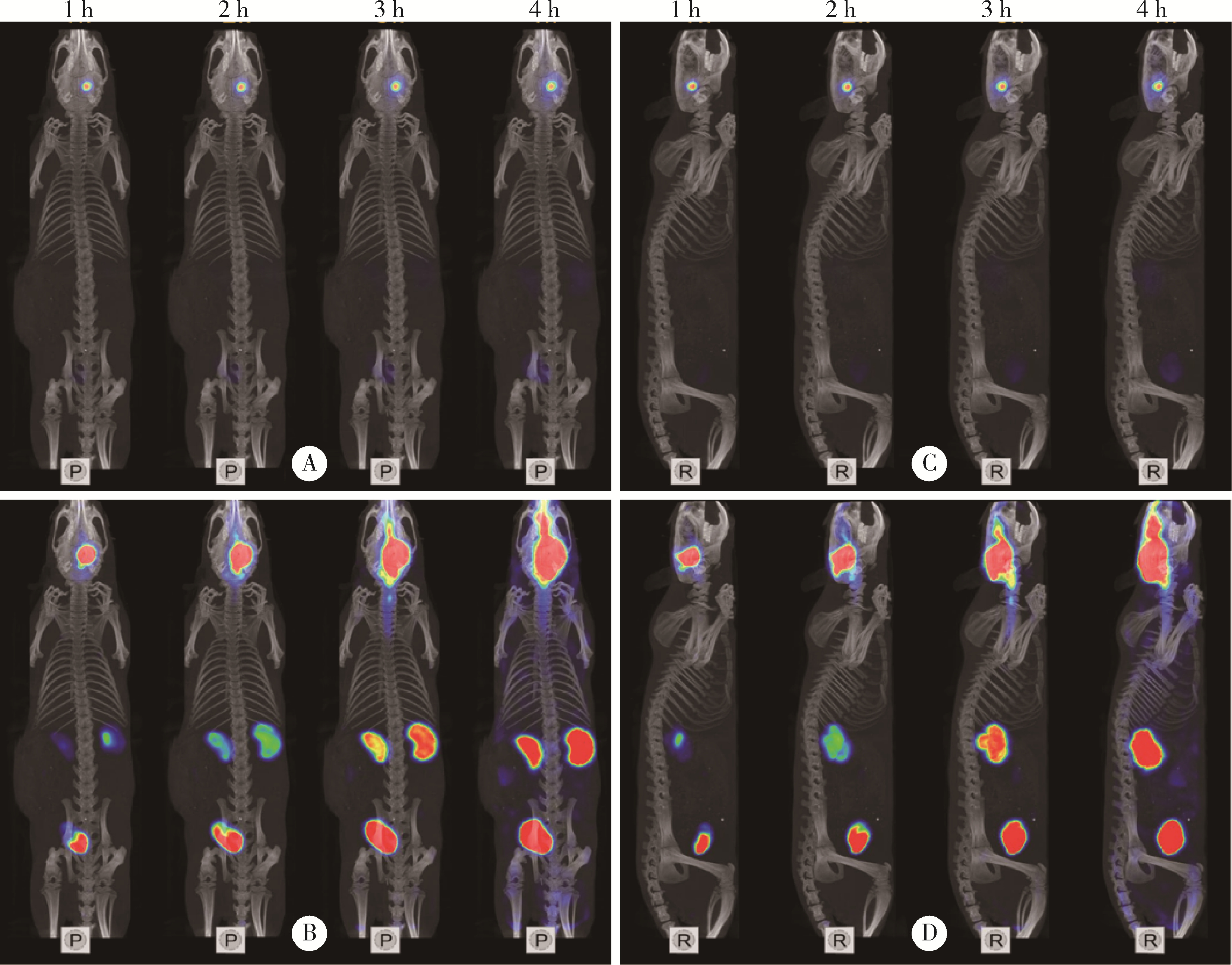 目的: 探索 99mTc-二乙基三胺五乙酸(99mTc-DTPA)经脑细胞外间隙(extracellular space, ECS)途径在不同脑区给药后,正常成年大鼠脑内及全身的药物动态分布及消除规律。方法: 使用鼠脑立体定位仪将SD大鼠固定,将体积为2 μL、放射性活度为3.7 MBq (100 μCi) 的 99mTc-DTPA分别注入大鼠的尾状核区和丘脑区,使用小动物单光子发射型计算机断层扫描/计算机断层扫描(single photon emission computed tomography/computed tomography, SPECT/CT)在不同时间显像,连续观察示踪剂的动态分布和消除规律。生物体内分布实验是在大鼠丘脑区和尾状核区注入 99mTc-DTPA,4 h后处死大鼠,收集血液、尿液,取大脑、小脑、心、肝、脾、肺、肾,称重后用γ计数器测定其放射性强度。结果: 99mTc-DTPA经脑ECS途径给药后,放射性分布浓聚于脑、肾和膀胱,左侧尾状核区给药的示踪剂优先向右侧小脑引流,右侧尾状核区给药的示踪剂优先向左侧小脑引流,尾状核区给药存在“对侧小脑优势引流”现象,而丘脑区给药后会优先向同侧小脑引流。给药4 h后,尿液、小脑和大脑出现高放射性摄取,其次是血液和肾,心、肝、脾、肺的放射性摄取值均较低,主要经泌尿系统排泄。结论: 经脑ECS途径给药是一种极具前景的给药方法,但不同脑区经该途径给药后的动态分布与消除规律存在明显差异,本研究进一步拓展了“脑分区”的内容与意义,也为未来经脑ECS途径给药进行脑病治疗和新药研发提供了理论基础。