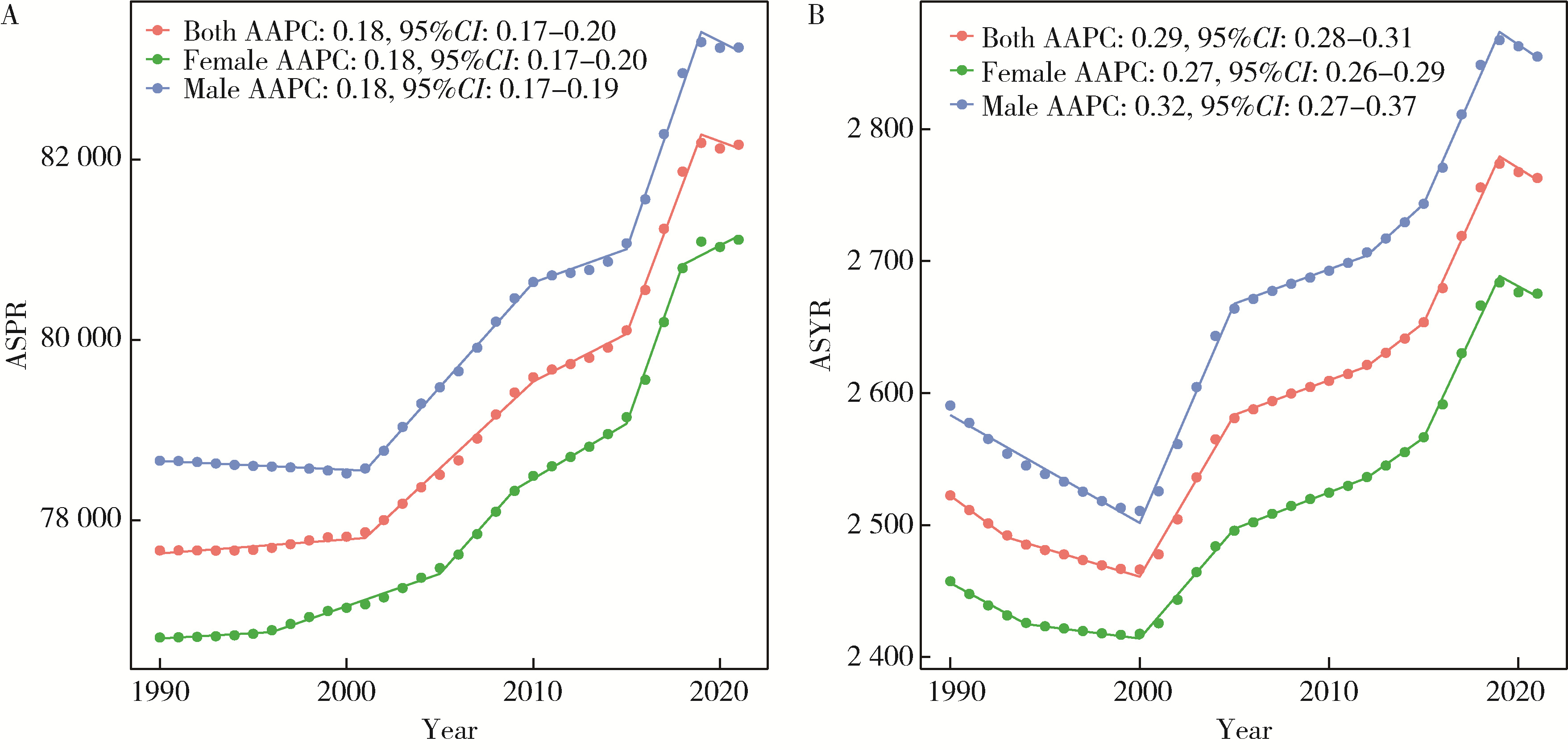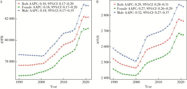 图1 1990—2021年中国增龄性听力损失的性别-年龄标准化患病率(A)及YLD率(B)Figure 1 Sex-age-standardized prevalence rate(A) and YLD rate(B) of age-related hearing loss in China from 1990 to 2021 ASPR, age-standardized prevalence rate; AAPC, average annual percent change; ASYR, age-standardized YLD rate; YLD, years lived with disability. |