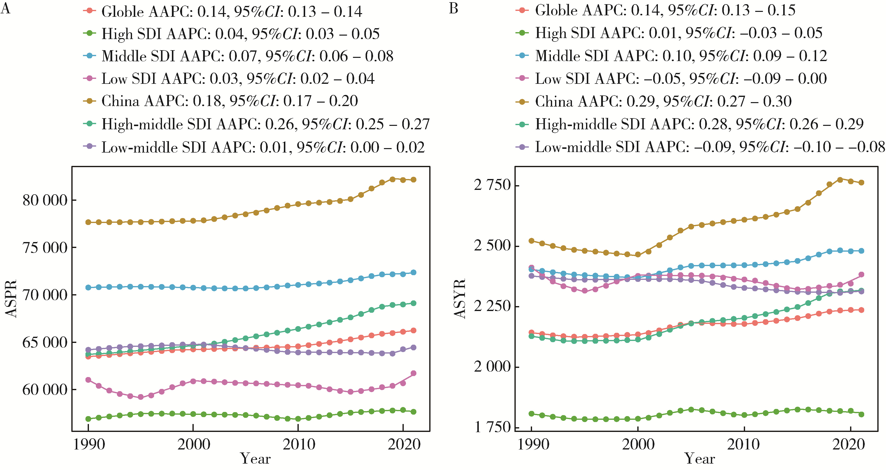 2.5 中国及全球不同SDI地区增龄性听力损失患病率及YLD率的AAPC