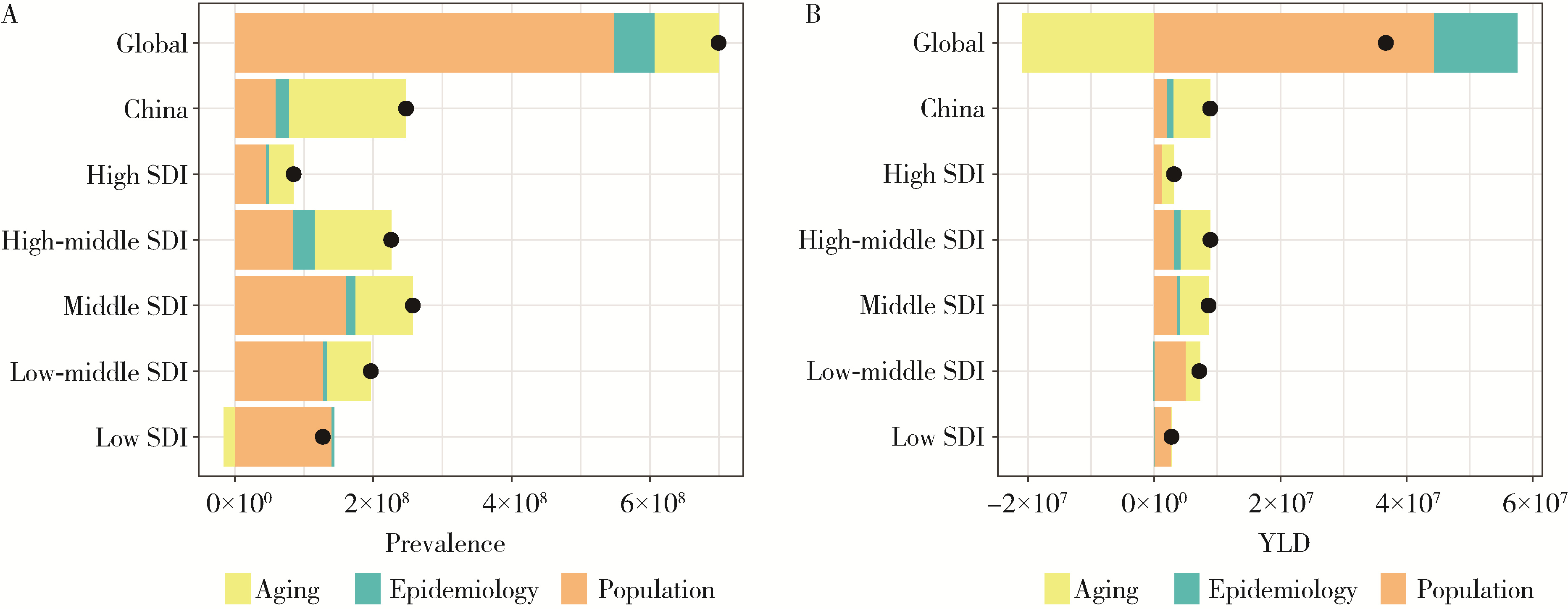 2.6 中国及全球不同SDI地区增龄性听力损失疾病负担改变的分解分析