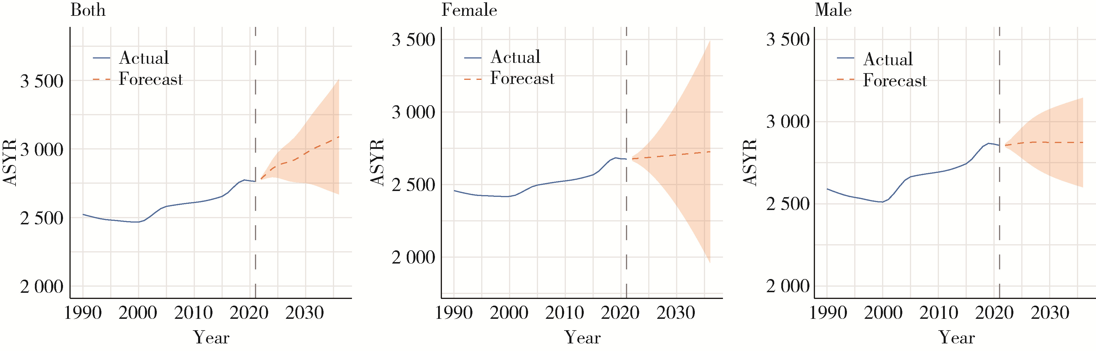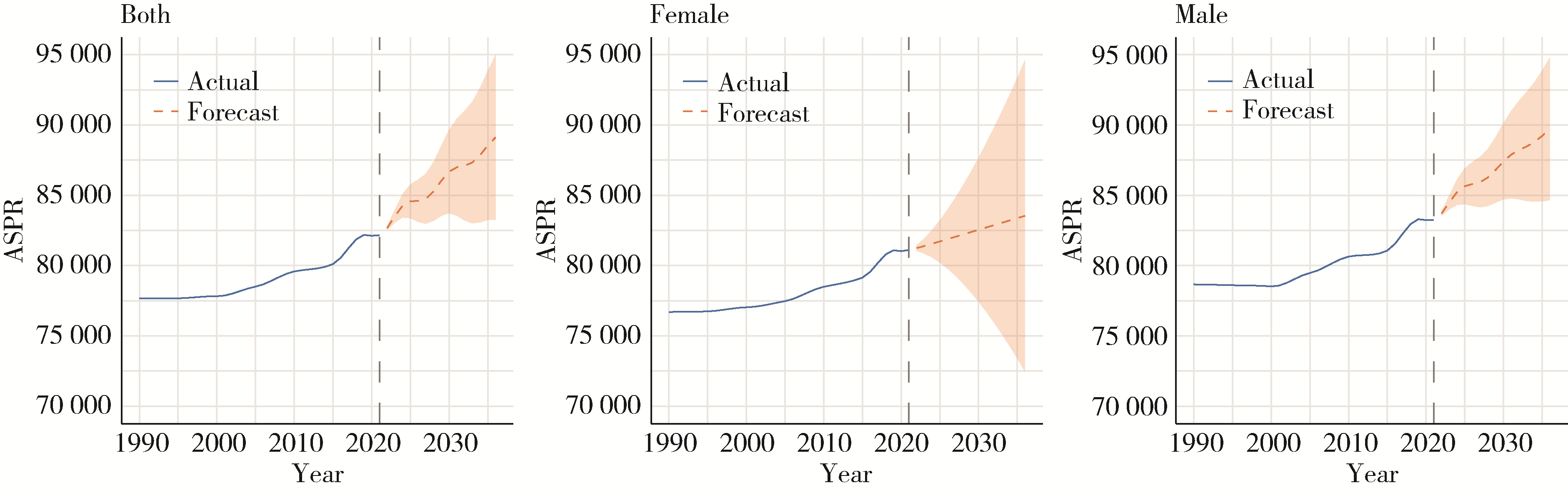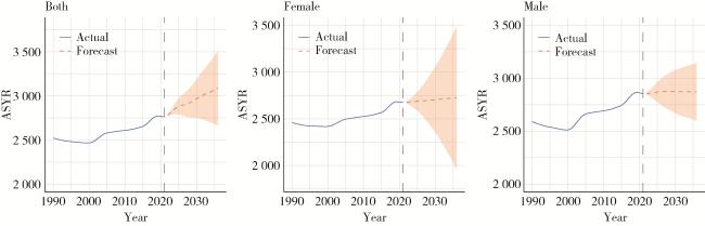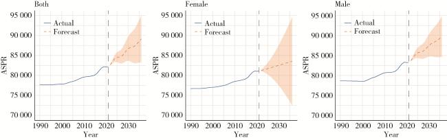 图4 未来15年(2022—2036年)增龄性听力损失性别-年龄标准化患病率趋势预测Figure 4 Prediction of trends in sex-age-standardized prevalence of age-related hearing loss over the next 15 years (from 2022 to 2036) ASPR, age-standardized prevalence rate. |