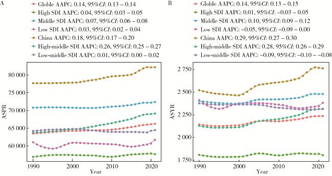 图2 1990—2021年中国及全球不同SDI地区增龄性听力损失的地区-年龄标准化患病率(A)及YLD率(B)Figure 2 Regional-age-standardized prevalence(A) and YLD rates(B) of age-related hearing loss in China and different SDI countries from 1990 to 2021 SDI, socio-demographic index; ASPR, age-standardized prevalence rate; AAPC, average annual percent change; ASYR, age-standardized YLD rate; YLD, years lived with disability. |