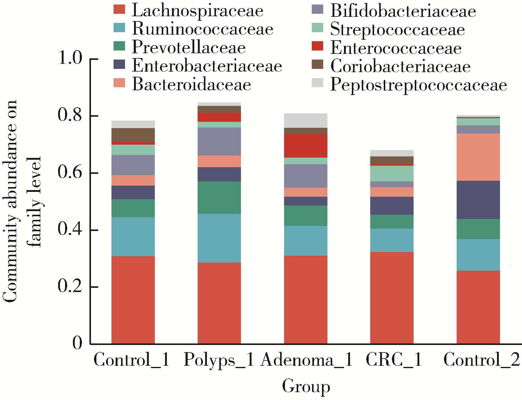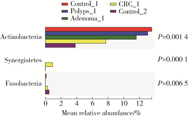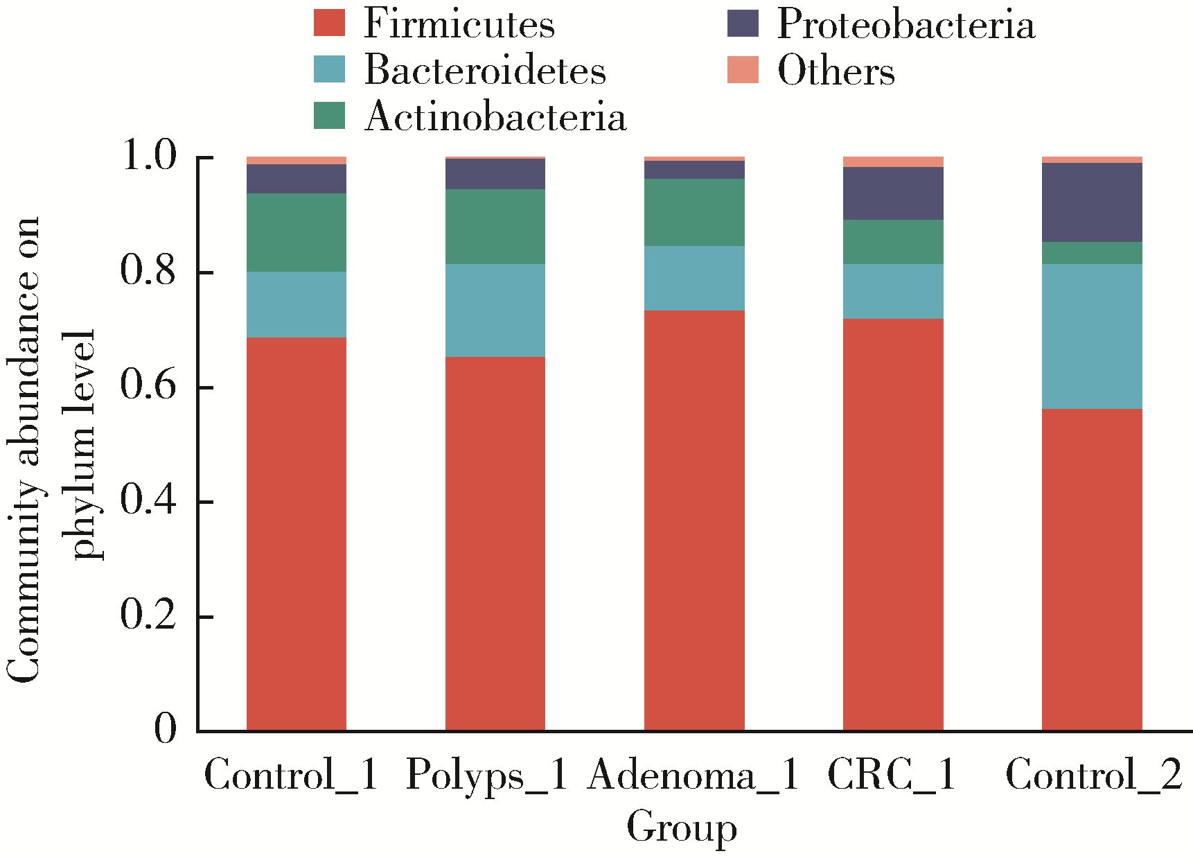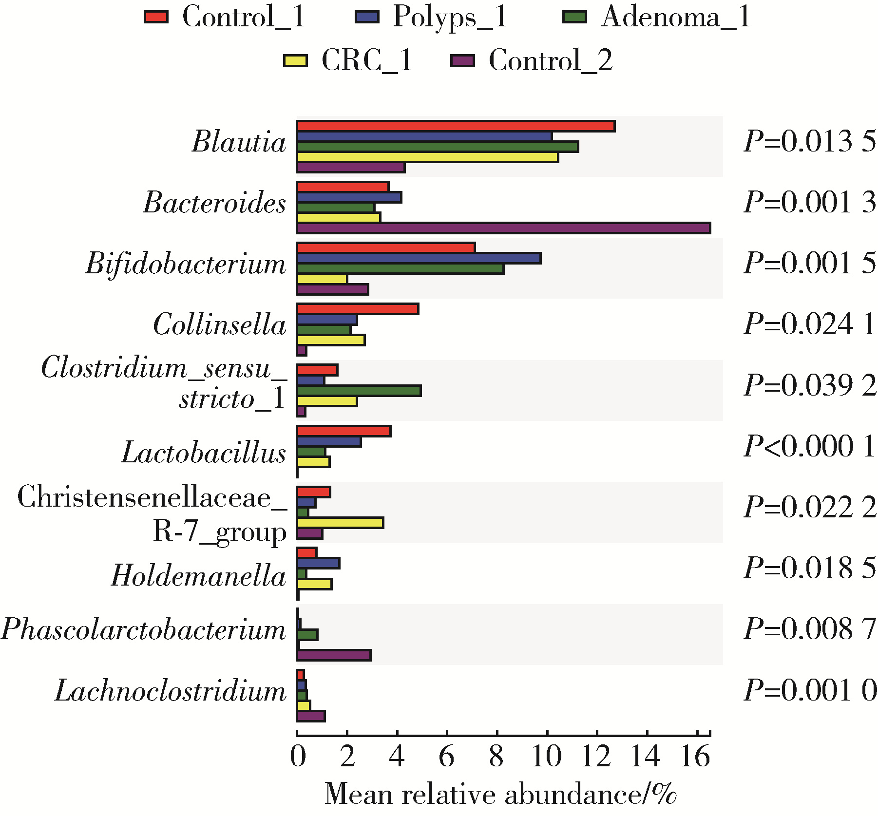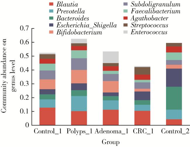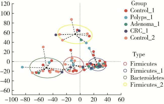 图1 各组间肠型聚类分析Figure 1 Analysis of enterotypes among groups X-axis and Y-axis are distance matrices calculated based on PCoA, indicating the two selected principal component axes, and the percentage indicates the value of the degree of explanation of the differences in the composition of the samples by the principal components; the scales of the X-axis and the Y-axis are relative distances without any practical significance. Control_1, high-altitude control; Polyps_1, high-altitude non-adenomatous polyp; Adenoma_1, high-altitude adenoma; CRC_1, high-altitude colorectal cancer; Control_2, low-altitude control. |