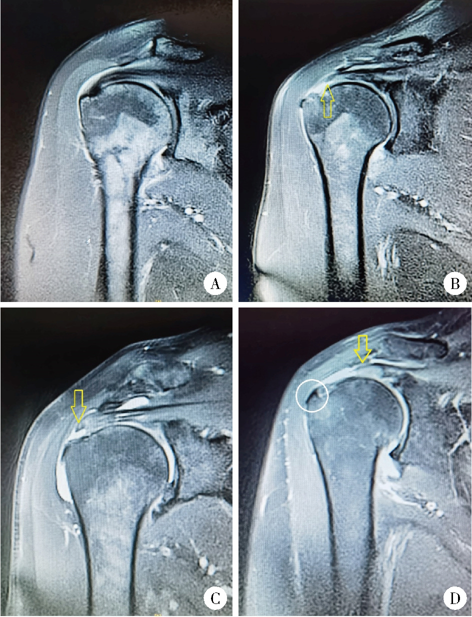 图1 各组肩袖撕裂患者的MRI影像Figure 1 MRI images of patients with rotator cuff tears in each group A, negative control group; B, partial RCTs (articular side) group; C, partial RCTs (bursal side) group; D, full-thickness RCTs group. The arrow indicates the site of RCTs, the circle marks the osteophytes of greater tuberosity of humerus. RCTs, rotator cuff tears. |
