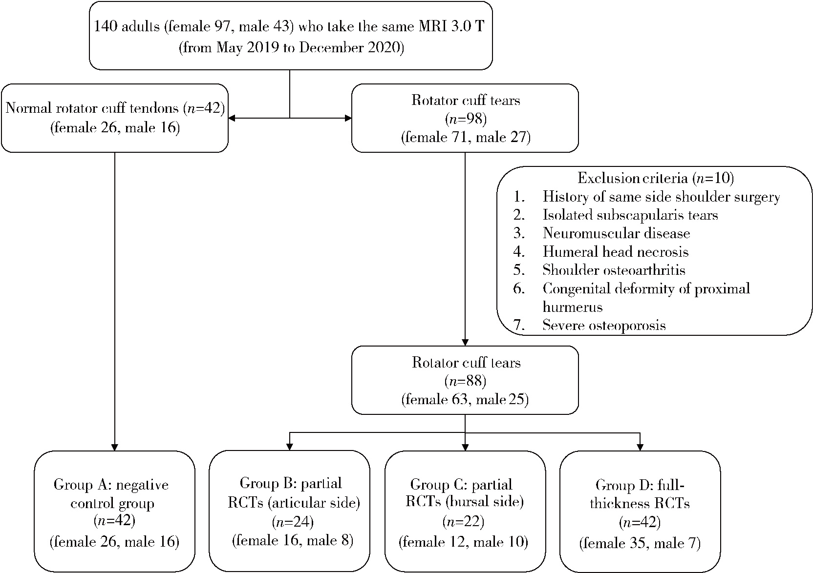 Group A, negative control group; Group B, partial RCTs (articular side); Group C, partial RCTs (bursal side); Group D, full-thickness RCTs. RCTs, rotator cuff tears; BMI, body mass index. |