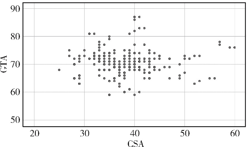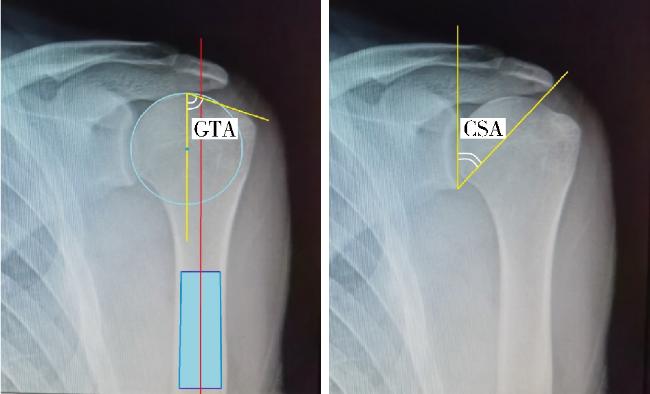 图5 GTA和CSA的散点图Figure 5 Scatter diagram of GTA and CSA GTA, greater tuberosity angle; CSA, critical shoulder angle. |