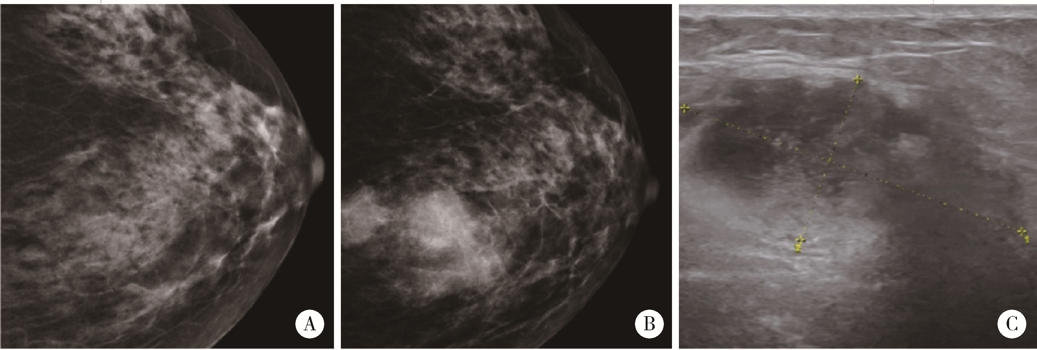 图2 左乳腺肿块钼靶X线检查Figure 2 Left breast mass examination A, mammogram (October 2021), multiple flaky or slightly high-density shadows are observed, with no apparent tumor identified; B, mammogram (October 2023), multiple circular and slightly high-density shadows are noted in the upper quadrant, approximately 8.5 cm from the nipple. The most extensive lesion measures approximately 3.5 cm×2.6 cm, with slightly blurred margins (Assessment: BI-RADS 4C); C, breast ultrasound (October 2023), a hypoechoic mass measuring 4.0 cm×1.9 cm is identified, exhibiting an irregular shape, indistinct margins, and no significant posterior acoustic changes (Assessment: BI-RADS 4B). |