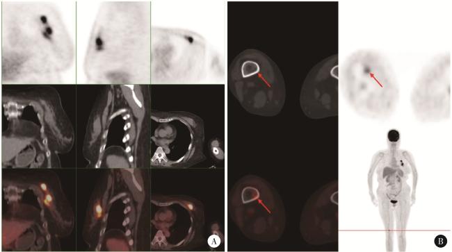 图1 患者PET/CT检查结果(2023年10月)Figure 1 PET/CT images of the patient (October 2023) A, left breast, multiple foci of increased flurodeoxyglucose (FDG) metabolism with a maximum standardized uptake value (SUVmax) of 10.1; B, right femur (distal), increased FDG metabolism with an SUVmax of 4.6. |