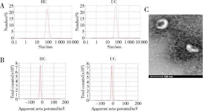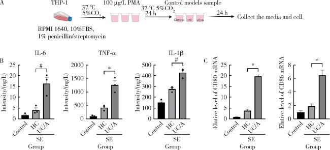 图5 唾液外泌体在体外对巨噬细胞的作用Figure 5 Effect of salivary exosomes on THP-1 cells in vitro A, co-culture model diagram of human monocyte leukemia cells (THP-1) cells and salivary exosomes; B, expression of inflammatory cytokines in cell culture supernatant detected by ELISA; C, mRNA expression profile of surface markers in M1 macrophages. Control, blank group without exosome stimulation; HC, healthy control; UC/A, active UC patients; SE, salivary exosomes. Data are $\bar x \pm s$, # P < 0.01, *P < 0.001. |