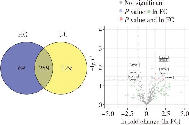2.2 健康对照组志愿者与溃疡性结肠炎患者中的唾液外泌体蛋白质差异分析