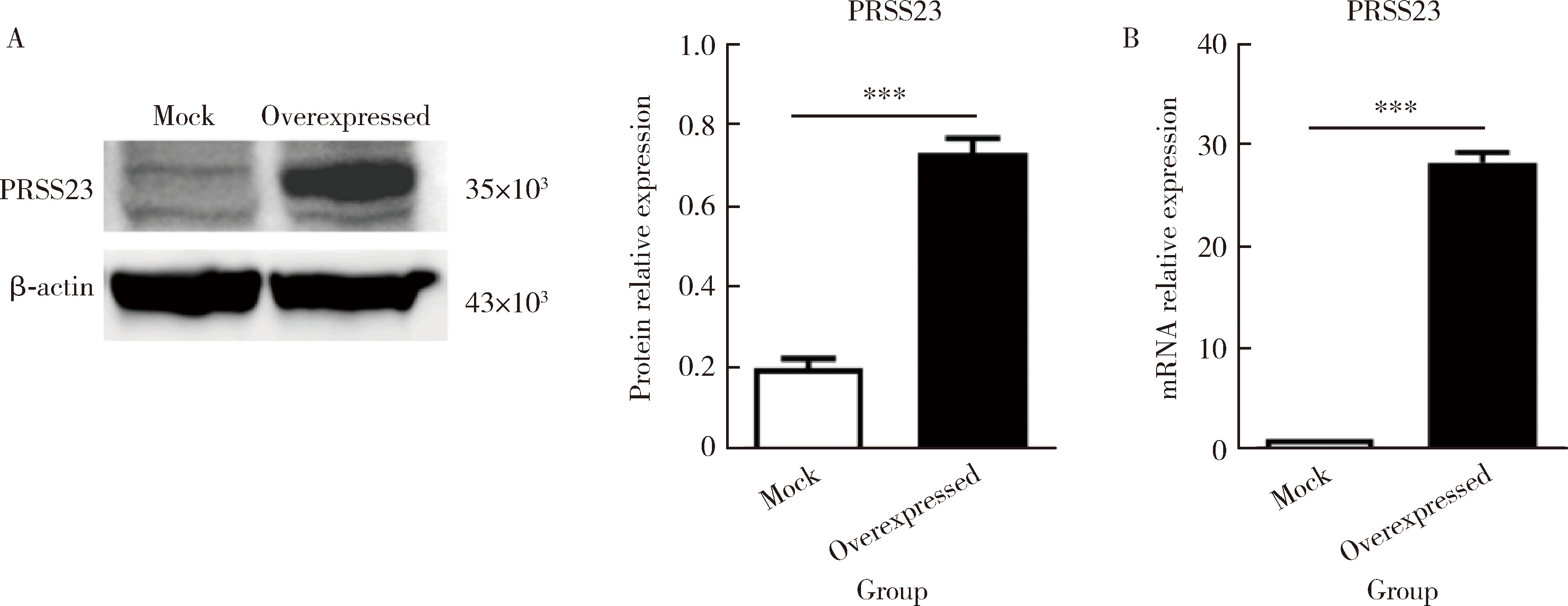 图2 转染PRSS23质粒的皮肤成纤维细胞过表达PRSS23Figure 2 Overexpression of PRSS23 in skin fibroblasts transfected with PRSS23 plasmid A, quantification of PRSS23 protein expression levels in fibroblasts transfected with PRSS23 plasmid or empty vector by Western blot. The PRSS23 protein expression was significantly increased in the overexpression group compared to the empty vector control group (n=4, P < 0.001). B, quantification of PRSS23 mRNA expression levels in two types of cells by RT-qPCR. The mRNA expression of PRSS23 was significantly higher in the overexpression group than in the empty vector control group (n=4, P < 0.001), indicating a successful transfection. The statistical method used was unpaired t test. *** P < 0.001. Mock, empty vector control group; Overexpressed, PRSS23 overexpression group; PRSS23, serine protease 23. |