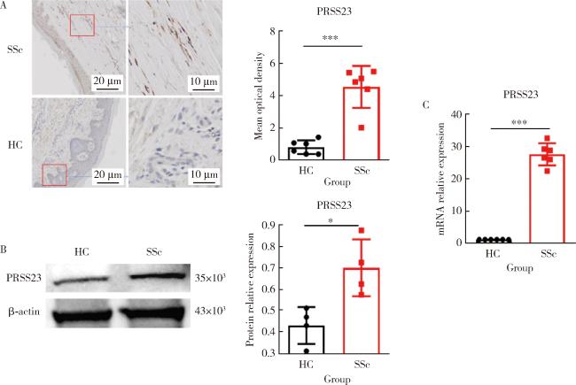 *P<0.05, ***P<0.001, HC vs. SSc. PRSS23, serine protease 23; HC, healthy control; SSc, systemic sclerosis. |