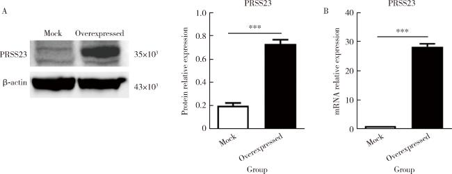 *** P<0.001, mock vs. overexpressed. Mock, empty vector control group; Overexpressed, PRSS23 overexpression group; PRSS23, serine protease 23; SE, standard error. |