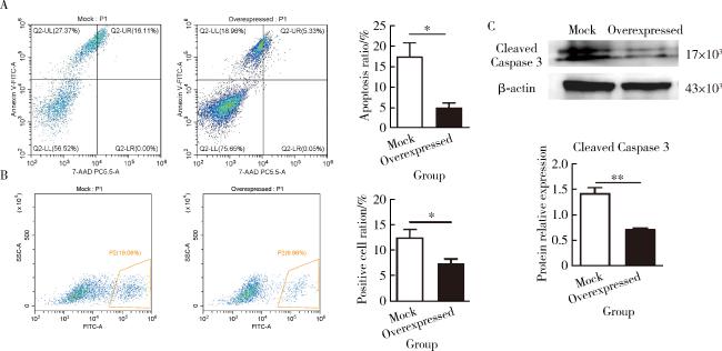 图3 过表达PRSS23抑制皮肤成纤维细胞凋亡Figure 3 Overexpression of PRSS23 inhibits apoptosis of skin fibroblasts A, BJ cells transfected with PRSS23 plasmid or empty vector were treated with 400 μmol/L hydrogen peroxide for 12 h to induce apoptosis. After staining with the Annexin V-FITC/7-AAD apoptosis detection kit, cells were analyzed by flow cytometry. Left panel shows the flow cytometry results, and the right panel shows the statistical analysis of apoptosis rate. Compared to the control group, the overexpression of PRSS23 decreased the apoptosis rate (n=4, P=0.022). B, after hydrogen peroxide treatment, cells were stained with anti-cleaved Caspase-3 antibody and analyzed by flow cytometry. Left panel shows the flow cytometry results, and the right panel shows the statistical analysis of cleaved Caspase-3 positive cells. Compared to the control group, the overexpression of PRSS23 reduced the ratio of cleaved Caspase-3 positive cells (n=4, P=0.026). C, the expression level of cleaved Caspase-3 in the two cell groups was quantified by Western blot. Top panel shows the Western blotting results, and the bottom panel shows the relative expression levels of cleaved Caspase-3 (n=4, P=0.003). The statistical analysis was performed using the unpaired t test. * P < 0.05, ** P < 0.01. Mock, empty vector control group; Overexpressed, PRSS23 overexpression group; PRSS23, serine protease 23; FITC, fluorescein isothiocyanate. |