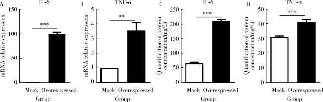 图4 过表达PRSS23促进皮肤成纤维细胞分泌促炎因子IL-6和TNF-αFigure 4 Overexpression of PRSS23 promotes the secretion of pro-inflammatory cytokines IL-6 and TNF-α in skin fibroblasts A, quantification of IL-6 mRNA expression in cells using RT-qPCR. Compared to the control group with empty vector, the PRSS23 overexpression group showed a significant increase in IL-6 mRNA expression (n=4, P < 0.001). B, quantification of TNF-α mRNA expression in cells using RT-qPCR. Compared to the control group with empty vector, the PRSS23 overexpression group showed a significant increase in TNF-α mRNA expression (n=4, P=0.004). C, quantification of IL-6 protein concentration in cell supernatants using ELISA. Compared to the control group with empty vector, the PRSS23 overexpression group showed a significant increase in IL-6 protein concentration (n=4, P < 0.001). D, quantification of TNF-α protein concentration in cell supernatants using ELISA. Compared to the control group with empty vector, the PRSS23 overexpression group showed a significant increase in TNF-α protein concentration (n=4, P < 0.001). Statistical analysis was performed using unpaired t test. ** P < 0.01, *** P < 0.001. Mock, empty vector control group; Overexpressed, PRSS23 overexpression group; PRSS23, serine protease 23; IL-6, interleukin-6; TNF-α, tumor necrosis factor-alpha; RT-qPCR, quantitative real-time PCR; ELISA, enzyme linked immunosorbent assay. |