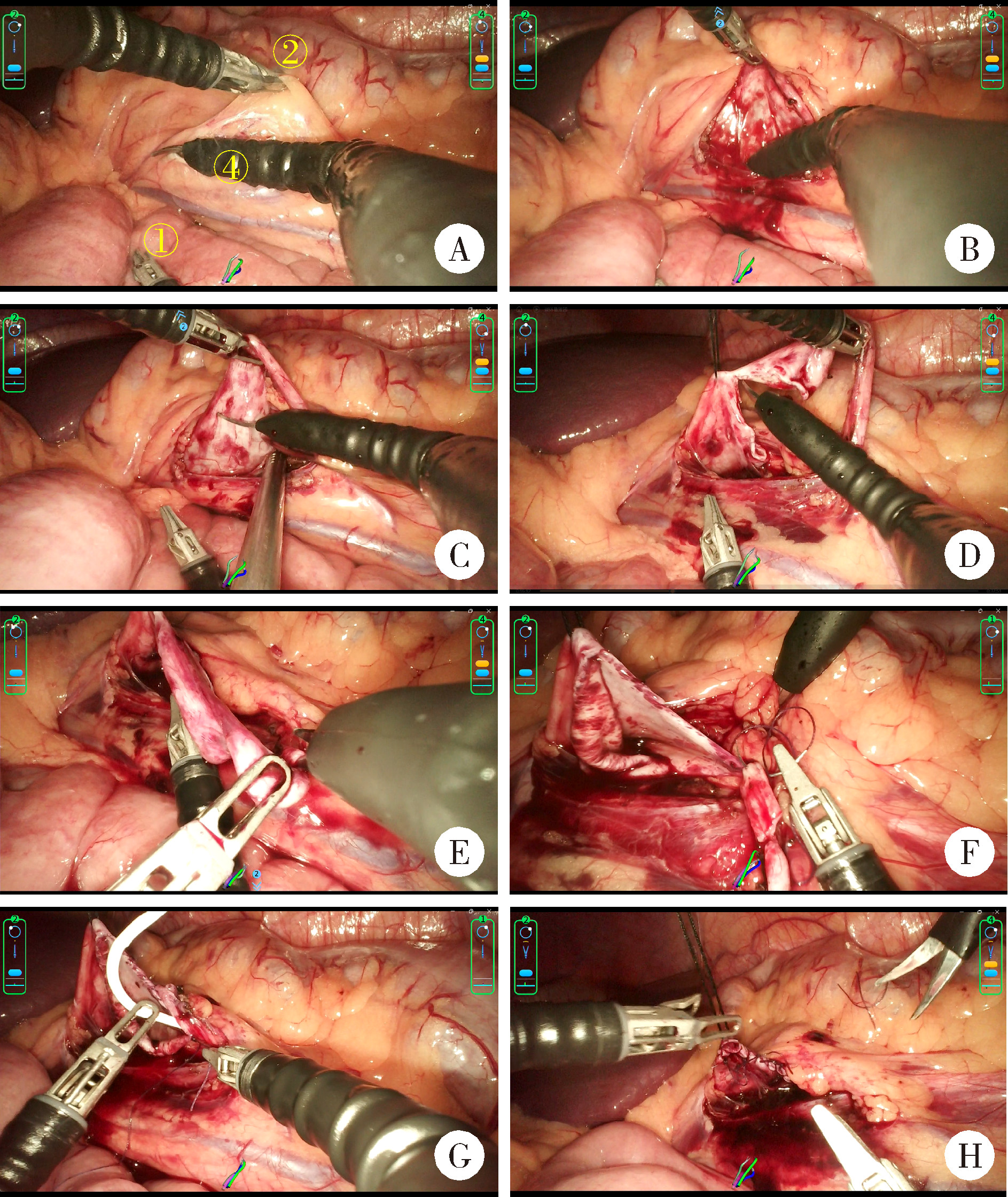 Key intraoperative steps and corresponding images (take a patient with left hydronephrosis as an example) A, robotic arm configuration: Arm ① (bottom) is the needle holder, Arm ② (left) is the bipolar forceps, Arm ④ (right) is the monopolar curved scissors; B, free the left descending colon mesentery; C, dissection of the ureteropelvic junction (UPJ); D, renal pelvis trimming; E, the ureter is incised distally from the stricture; F, continuous suturing of the posterior wall between the ureter and renal pelvis; G, placement of a double-J stent; H, continuous suturing of the anterior wall between the ureter and renal pelvis."