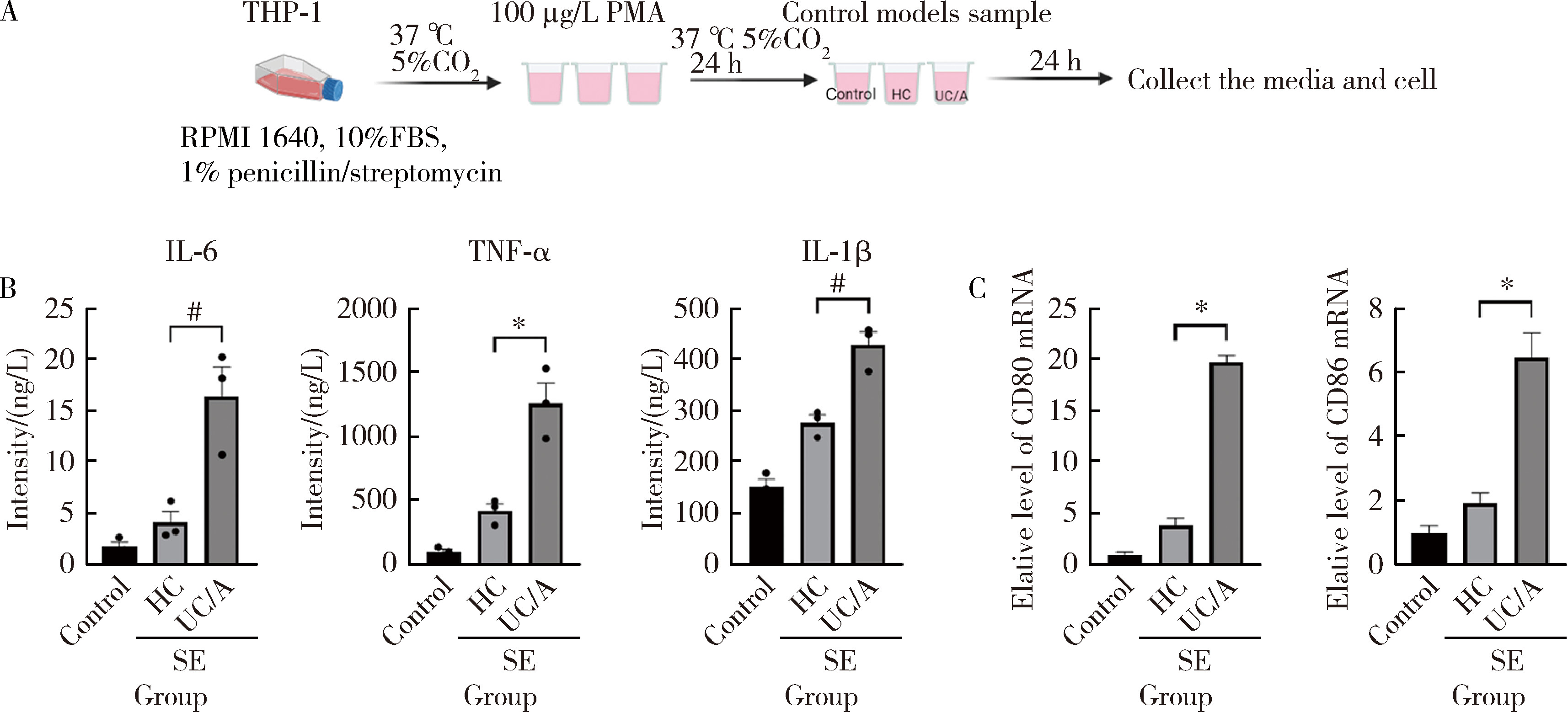 Effect of salivary exosomes on THP-1 cells in vitro A, co-culture model diagram of human monocyte leukemia cells (THP-1) cells and salivary exosomes; B, expression of inflammatory cytokines in cell culture supernatant detected by ELISA; C, mRNA expression profile of surface markers in M1 macrophages. Control, blank group without exosome stimulation; HC, healthy control; UC/A, active UC patients; SE, salivary exosomes. Data are $\bar x \pm s$, # P < 0.01, *P < 0.001."
