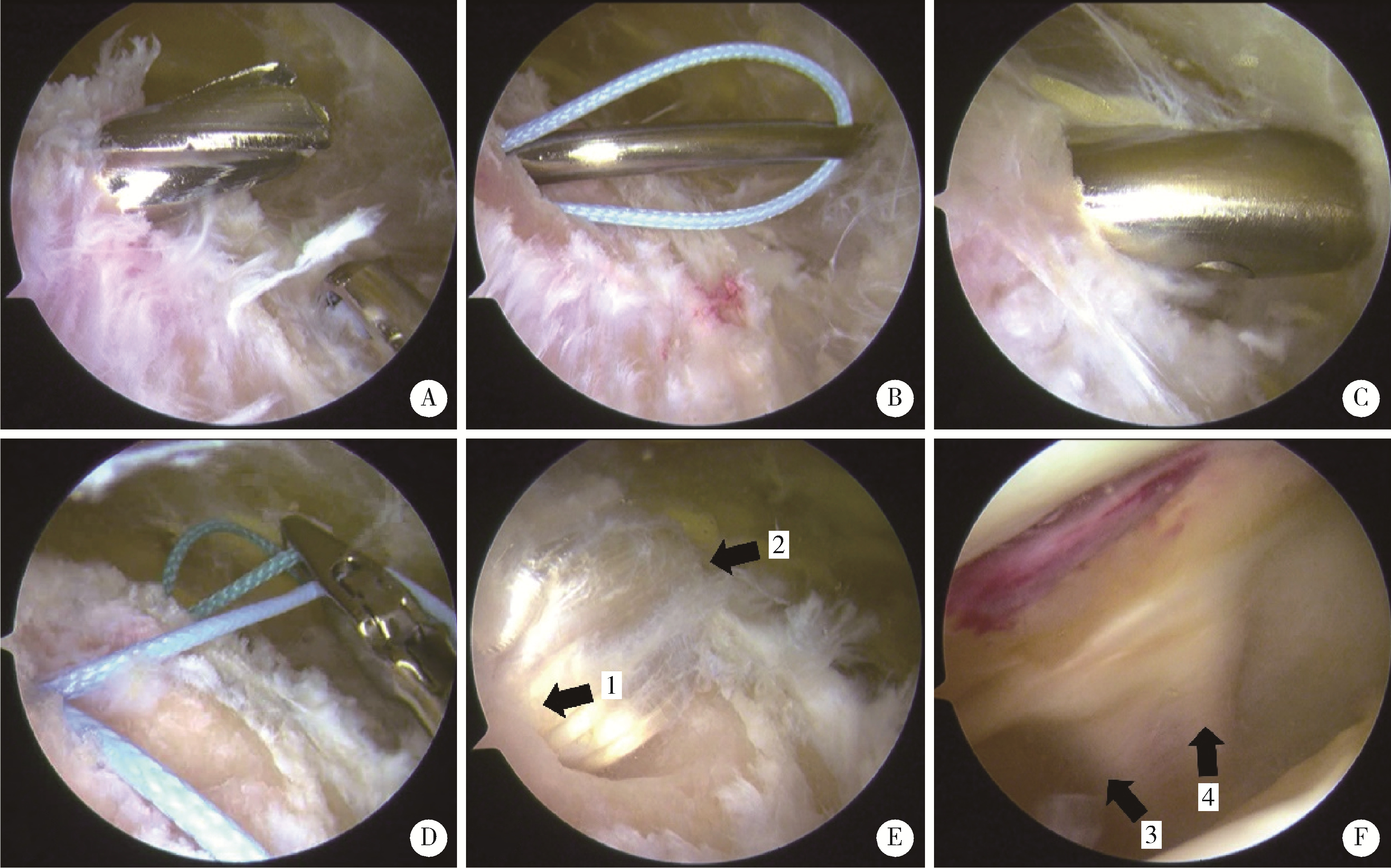 Arthroscopically assisted medial patellofemoral complex reconstruction A, a patellar tunnel was made at the upper third point of the medial patella with a 4.5 mm drill; B, guide sutures were introduced through the patellar tunnel with an eyelet pin; C, a quadricep-tendon tunnel was created at the midpoint of the superior patella using a blunt cannula; D, guide sutures were pulled out through the medial femoral incision with a grasper; E, the autograft was introduced into the patellar tunnel (arrow 1) and the quadricep-tendon tunnel (arrow 2) with guide sutures; F, intraarticular view of the double-bundle (arrow 3 and 4) reconstructed graft."