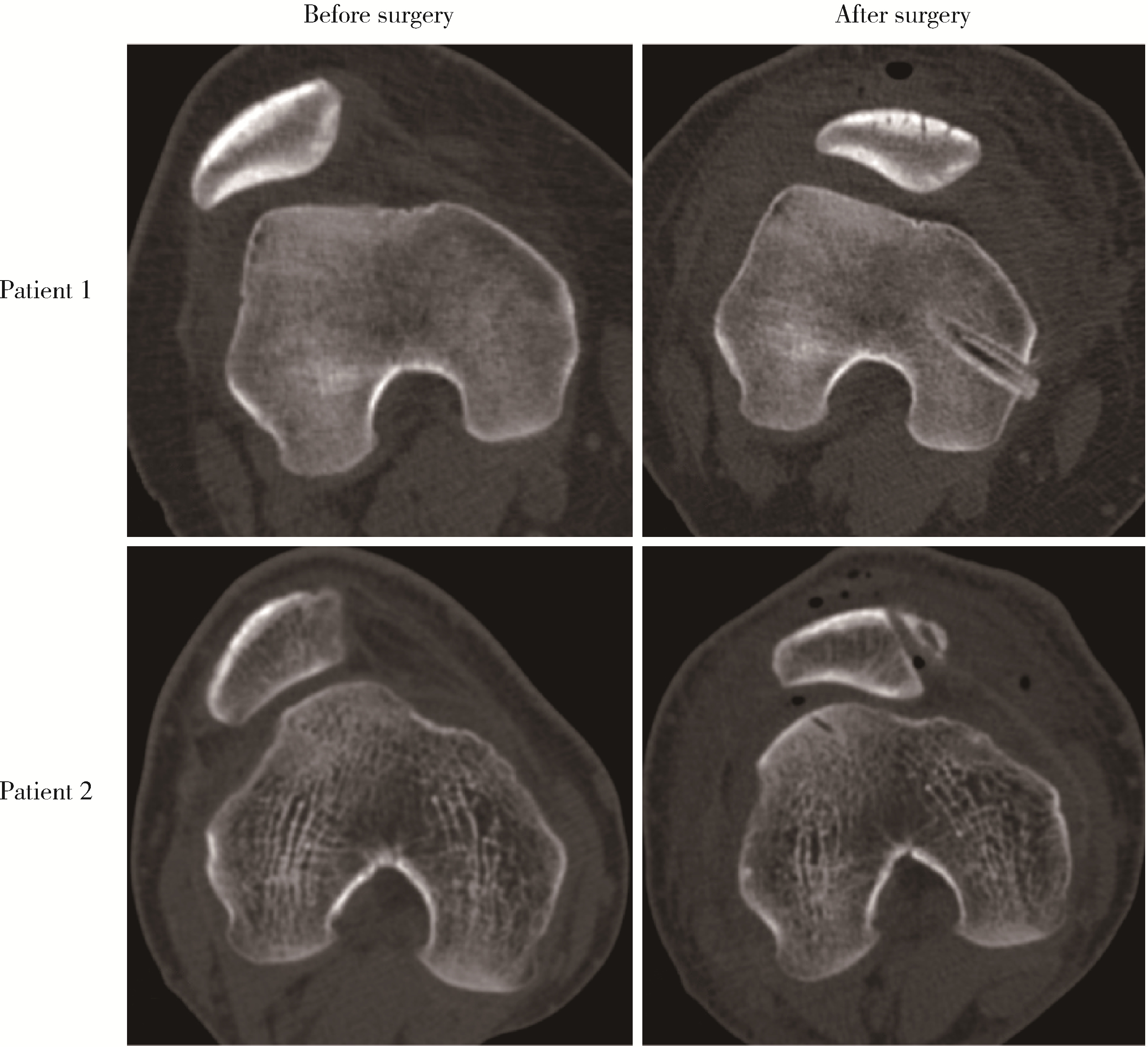 Comparison of axial CT scans of the patellofemoral joint before and after MPFC reconstruction Patient 1 was a 17-year-old male diagnosed with recurrent patellar dislocation of the right knee. Preoperative CT scan showed significant patellar tilt and lateral displacement, which were both corrected on postoperative scan. Patient 2 was a 16-year-old male diagnosed with recurrent patellar dislocation of the right knee. Preoperative CT scan demonstrated a dislocated patella with remarkable tilt and lateral translation, while the patellofemoral congruence was restored on postoperative scan. CT, computed tomography; MPFC, medial patellofemoral complex reconstruction."