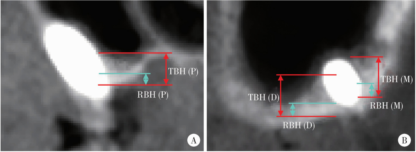 Measurement of osteogenic height in maxillary sinus floor TBH, total bone height; RBH, residual bone height; P, palatal; M, mesial; D, distal."