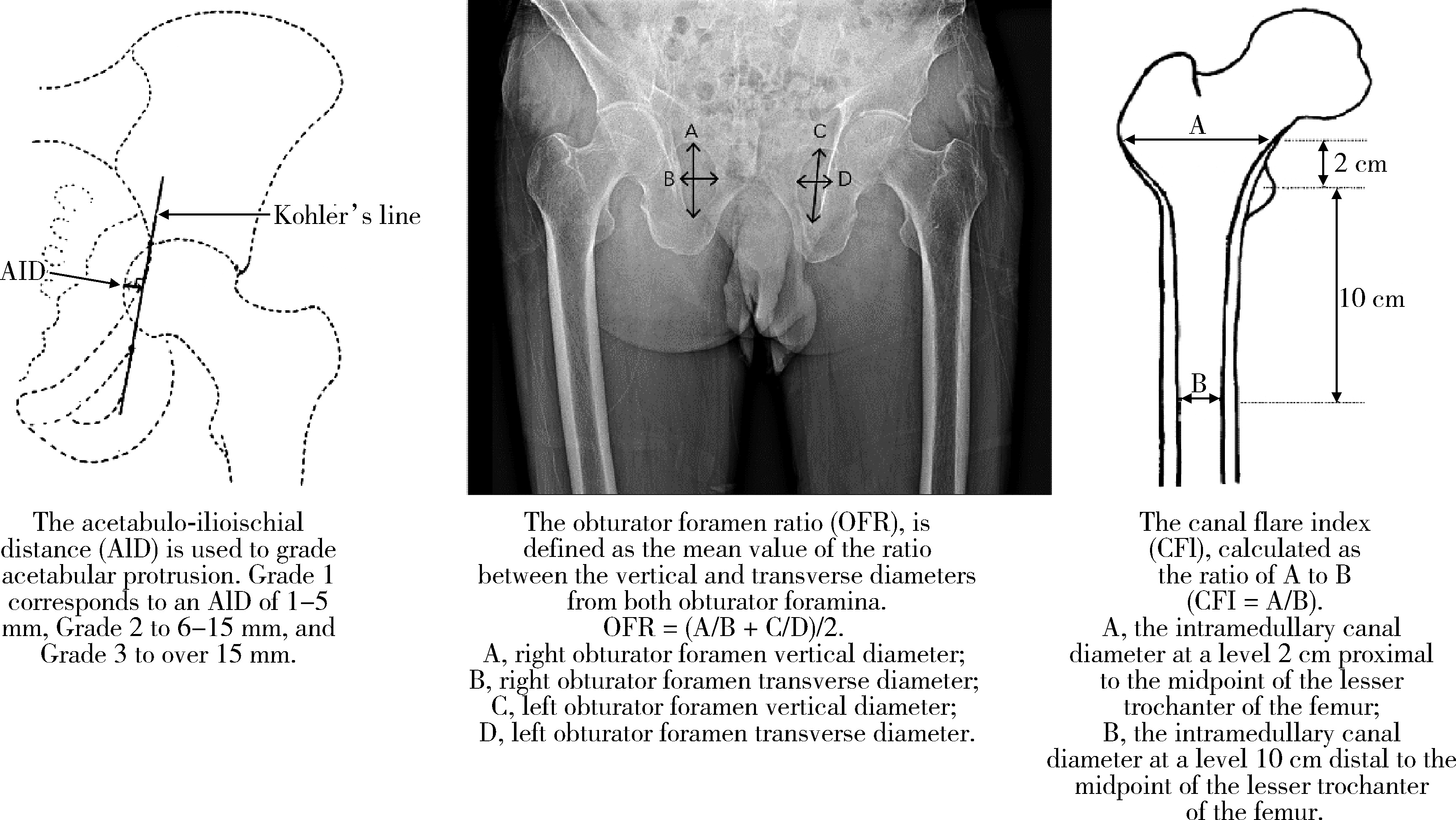 Trend analysis of radiographic parameters OFR, obturator foramen ratio; CFI, canal flare index; NSA, neck shaft angle."