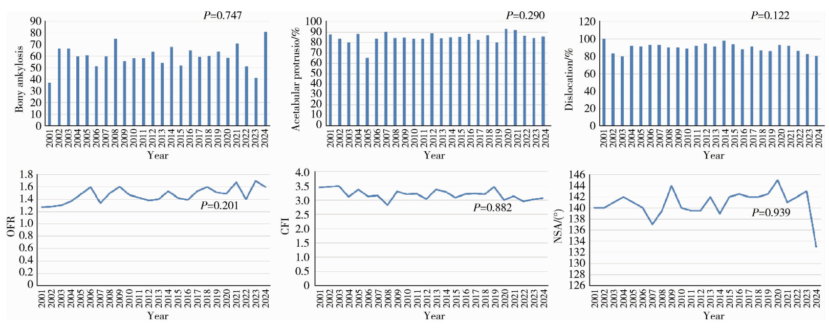 Comparison of clinical and radiographic parameters between the 2001-2012 inpatient group and the 2013-2024 inpatient group (calculated by number of hip joints)"
