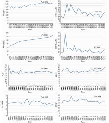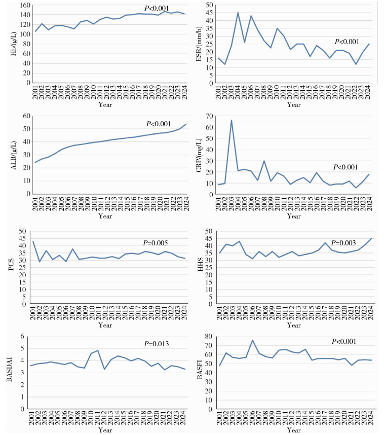 Trend analysis of laboratory test results and disease-related parameters Hb, hemoglobin; ESR, erythrocyte sedimentation rate; CRP, C-reactive protein; ALB, albumin; PCS, physical component summary; HHS, Harris hip score; BASDAI, Bath ankylosing spondylitis disease activity index; BASFI, Bath ankylosing spondylitis functional index."