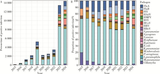 图2 2015—2024年呼吸道病原体的流行特征趋势Figure 2 Epidemiological characteristics and trends of respiratory pathogens from 2015 to 2024 A, person-time of positive infection; B, proportion of positive infection. FluA, influenza A virus; FluB, influenza B virus; PIV, parainfluenza virus; HAdV, human adenovirus; HMPV, human metapneumovirus; RSV, respiratory syncytial virus; HCoV, human coronavirus; HRV, human rhinovirus; HBoV, human bocavirus; S. pneumoniae, Streptococcus pneumoniae; S. pyogenes, Streptococcus pyogenes; S. aureus, Staphylococcus aureus; H. influenzae, Haemophilus influenzae; B. pertussis, Bordetella pertussis; E. coli, Escherichia coli; K. pneumoniae, Klebsiella pneumoniae; M. tuberculosis, Mycobacterium tuberculosis; P. aeruginosa, Pseudomonas aeruginosa; L. pneumophila, Legionella pneumophila; M. pneumoniae, Mycoplasma pneumoniae. |