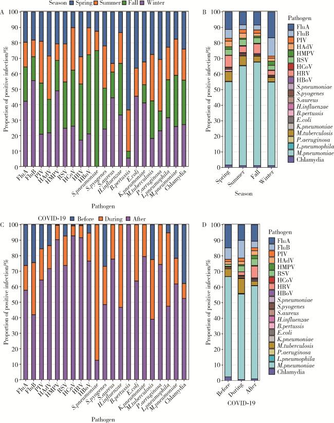 图3 呼吸道病原体的季节和新型冠状病毒感染时期分布Figure 3 Seasonal and COVID-19 epidemic periodic distribution of respiratory pathogens A, proportion of seasons by pathogens infection; B, proportion of pathogens infection by season; C, proportion of COVID-19 epidemic periods by pathogens infection; D, proportion of pathogens infection by COVID-19 epidemic period. COVID-19, coronavirus disease 2019; FluA, influenza A virus; FluB, influenza B virus; PIV, parainfluenza virus; HAdV, human adenovirus; HMPV, human metapneumovirus; RSV, respiratory syncytial virus; HCoV, human coronavirus; HRV, human rhinovirus; HBoV, human bocavirus; S. pneumoniae, Streptococcus pneumoniae; S. pyogenes, Streptococcus pyogenes; S. aureus, Staphylococcus aureus; H. influenzae, Haemophilus influenzae; B. pertussis, Bordetella pertussis; E. coli, Escherichia coli; K. pneumoniae, Klebsiella pneumoniae; M. tuberculosis, Mycobacterium tuberculosis; P. aeruginosa, Pseudomonas aeruginosa; L. pneumophila, Legionella pneumophila; M. pneumoniae, Mycoplasma pneumoniae. |