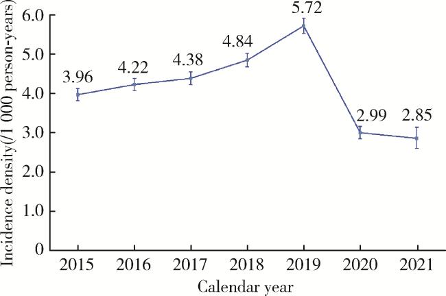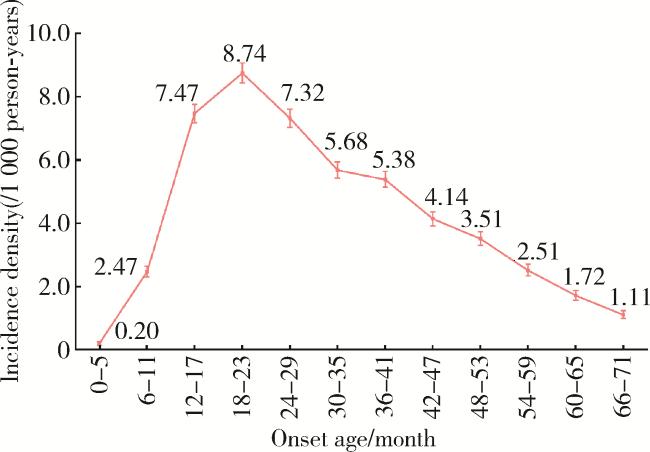 表2 2015—2021年宁波市6岁以下儿童FS发病密度的人群分布特征Table 2 Population characteristics of the FS incidence density among children under 6 years old in Ningbo City from 2015 to 2021 |