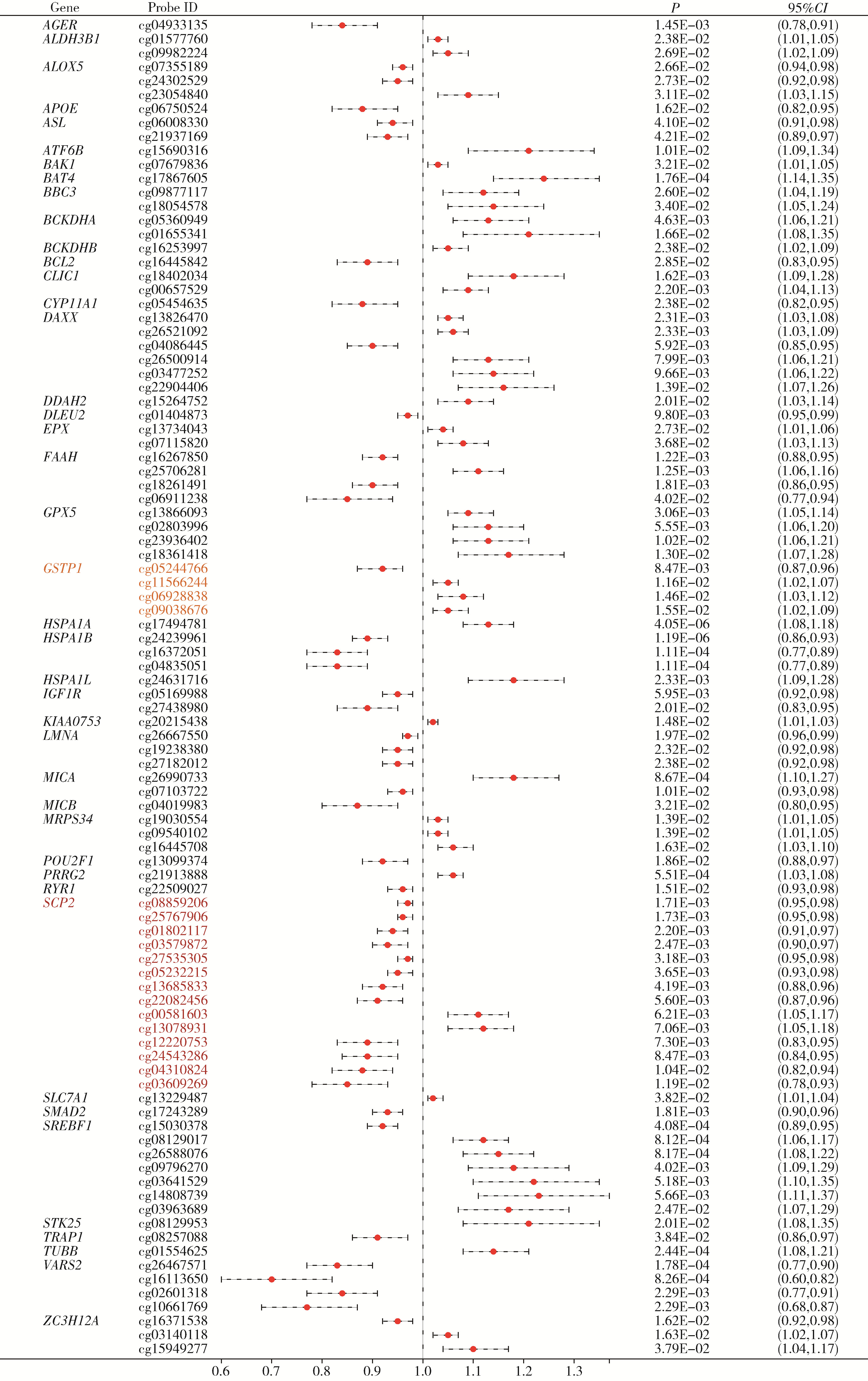 图1 基于汇总数据的孟德尔随机化分析中氧化应激相关基因甲基化水平与前列腺癌的关系Figure 1 Association between methylation levels of oxidative stress-related genes and prostate cancer risk in summary-data-based Mendelian randomization (SMR) analysis |