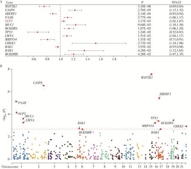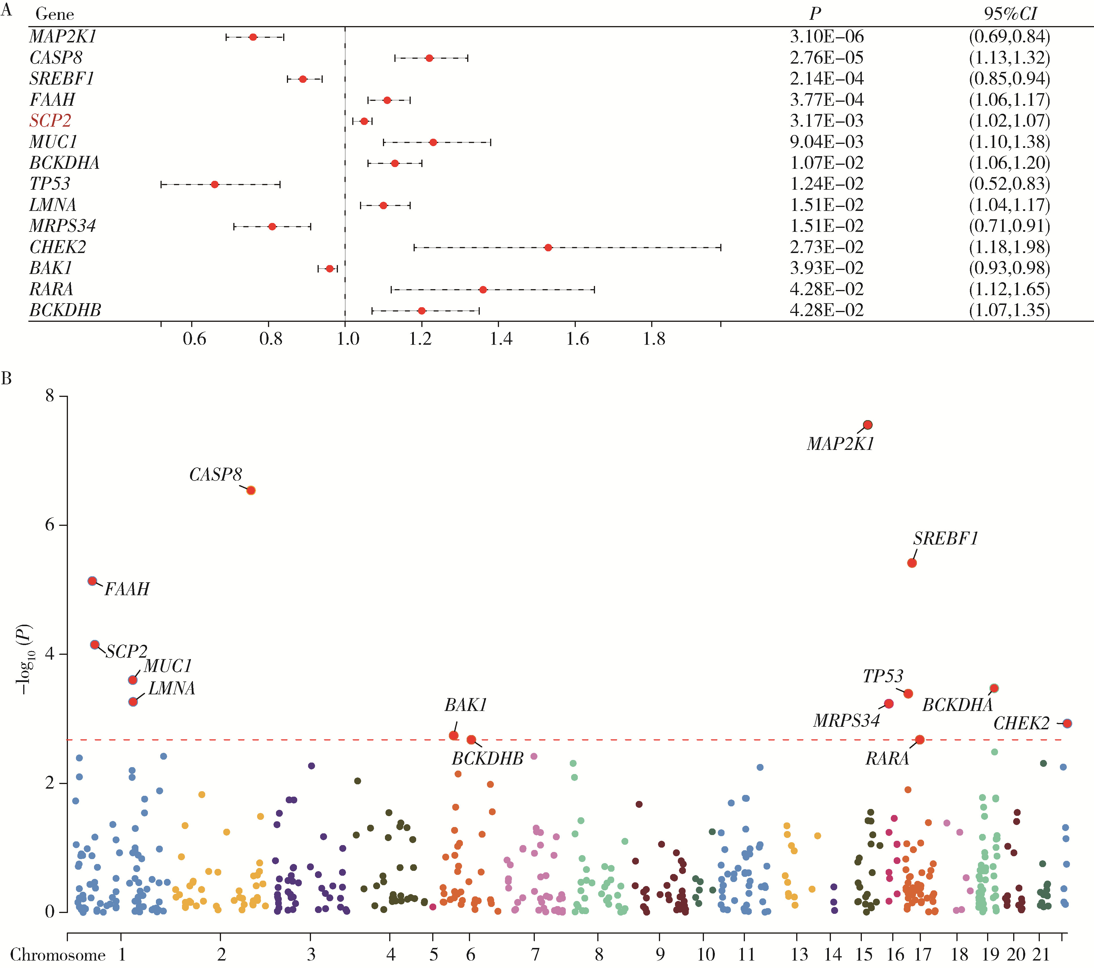 图4 不同氧化应激相关基因循环蛋白质层面与前列腺癌的关系Figure 4 Association between circulating protein levels of oxidative stress-related genes and prostate cancer A, relationship between oxidative stress-related circulating proteins and prostate cancer in Mendelian randomization analysis; B, Manhattan plot of oxidative stress-related proteins with statistically significant associations. |