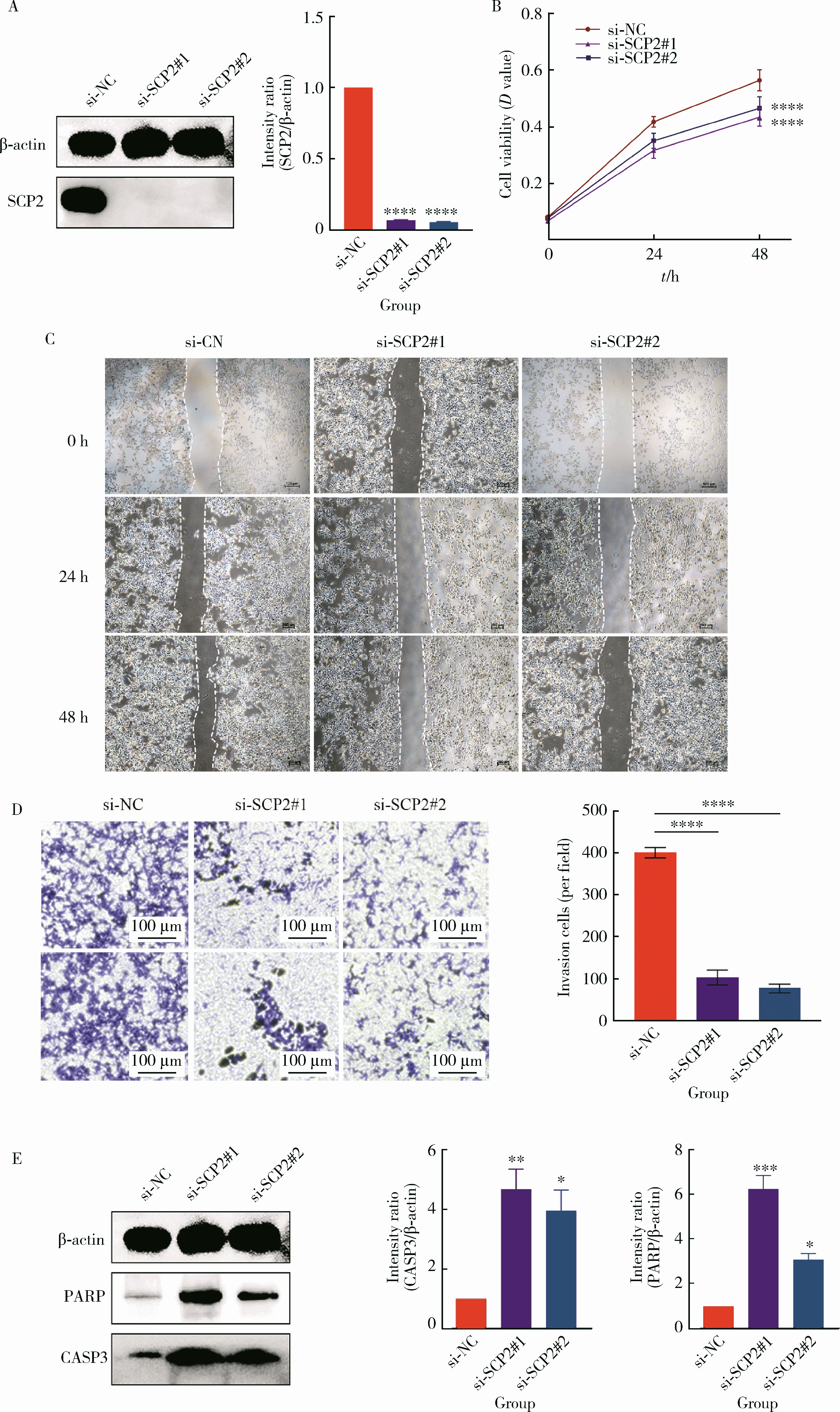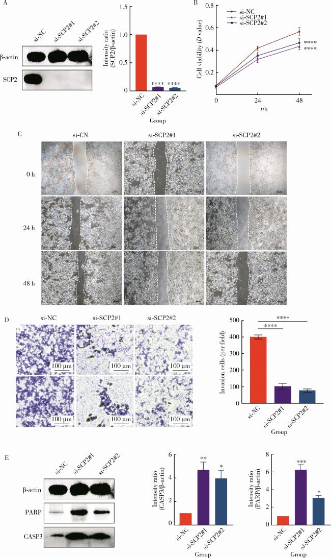 图5 敲除SCP2可抑制前列腺肿瘤细胞的致癌表型并促进其凋亡Figure 5 Knockdown of SCP2 suppresses the oncogenic phenotype of prostate cancer cells and promotes apoptosis A, siRNA treatment of C4-2 cells significantly decreased SCP2 protein expression (* * * *P < 0.000 1); B, knockdown of SCP2 significantly reduced the proliferative capacity of C4-2 cells (* * * *P < 0.000 1); C, D, knockdown of SCP2 markedly suppressed the migration and invasion abilities of C4-2 cells (* * * *P < 0.000 1); E, knockdown of SCP2 increased the expression of apoptotic markers CASP3 (* *P < 0.01 & *P < 0.05) and PARP (* * *P < 0.001 & *P < 0.05) in C4-2 cells. |
