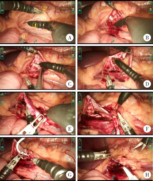 图1 术中关键步骤对应图(以1例左侧肾积水患者为例)Figure 1 Key intraoperative steps and corresponding images (take a patient with left hydronephrosis as an example) A, robotic arm configuration: Arm ① (bottom) is the needle holder, Arm ② (left) is the bipolar forceps, Arm ④ (right) is the monopolar curved scissors; B, free the left descending colon mesentery; C, dissection of the ureteropelvic junction (UPJ); D, renal pelvis trimming; E, the ureter is incised distally from the stricture; F, continuous suturing of the posterior wall between the ureter and renal pelvis; G, placement of a double-J stent; H, continuous suturing of the anterior wall between the ureter and renal pelvis. |